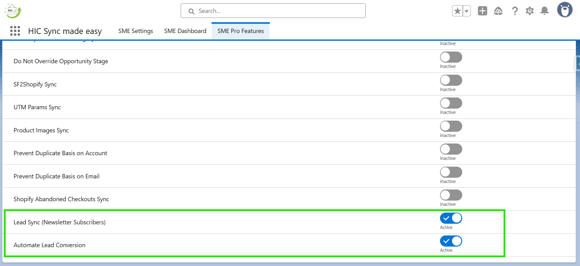 Step 1: Open your Salesforce organization and navigate to the “SME Features” tab.