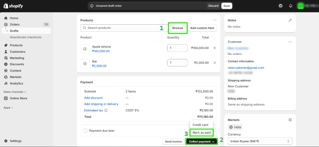 Step 9: Click on “Browse” and select the products then click on “Collect Payment” then click on “Mark as paid” to create an order.