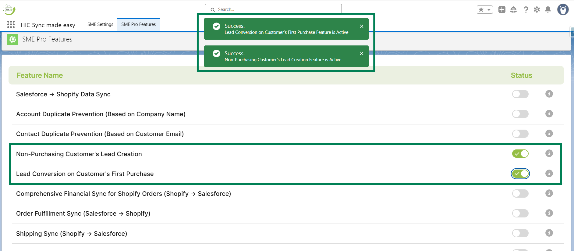 Step 3: Enable the “Non-Purchasing Customer's Lead Creation” and “Lead Conversion on Customer's First Purchase” Feature toggle button.