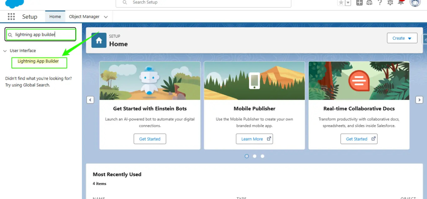 2. Go to Setup and Search “Lightning App Builder” in the Quick Find box.