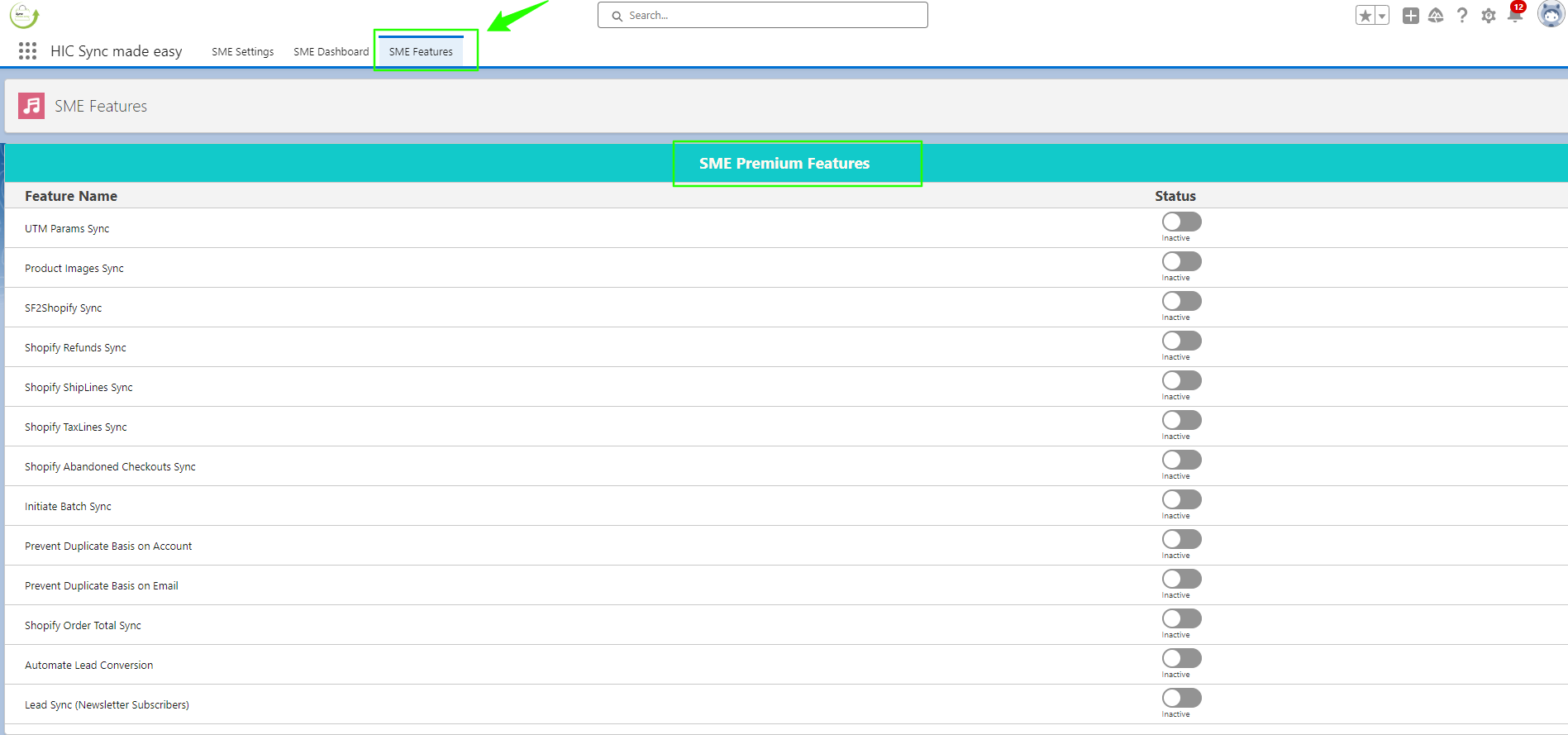 Note: All the SME features are marked inactive by default. Please make the status button active to utilize these functionalities.