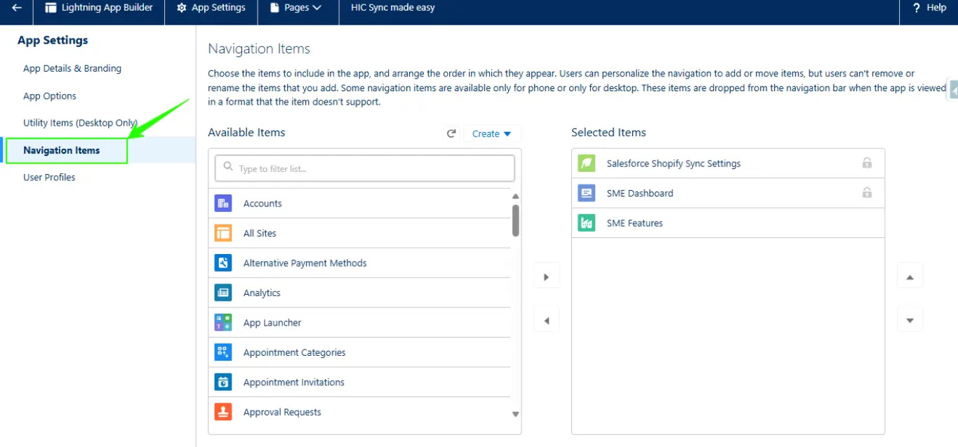5. Go to “Navigation Items” under the “App Settings” option and Click on it.