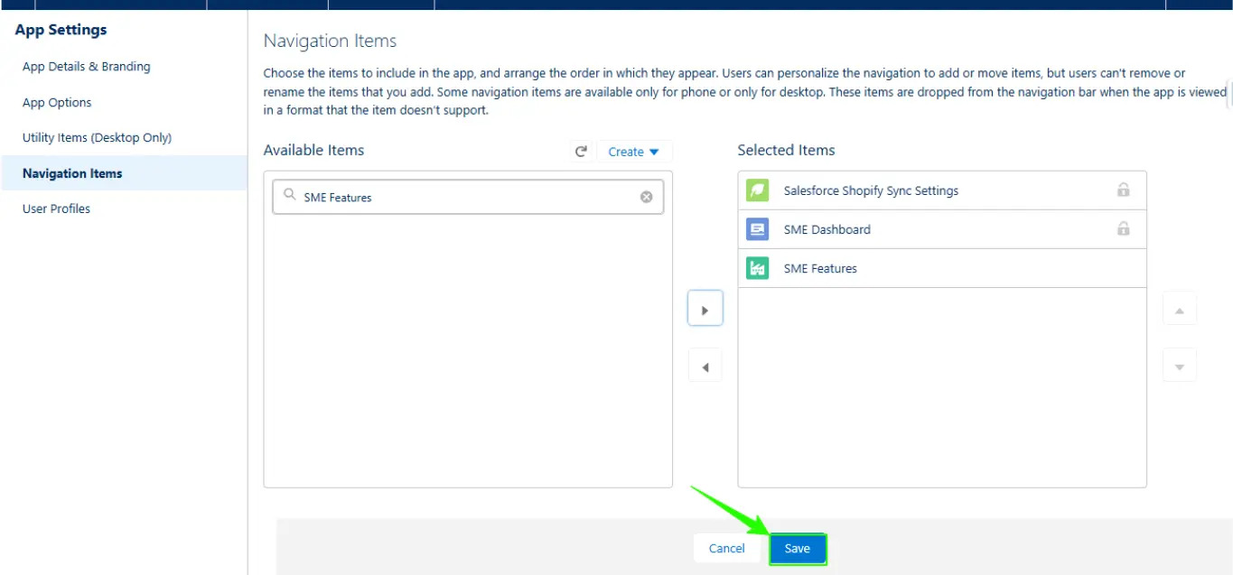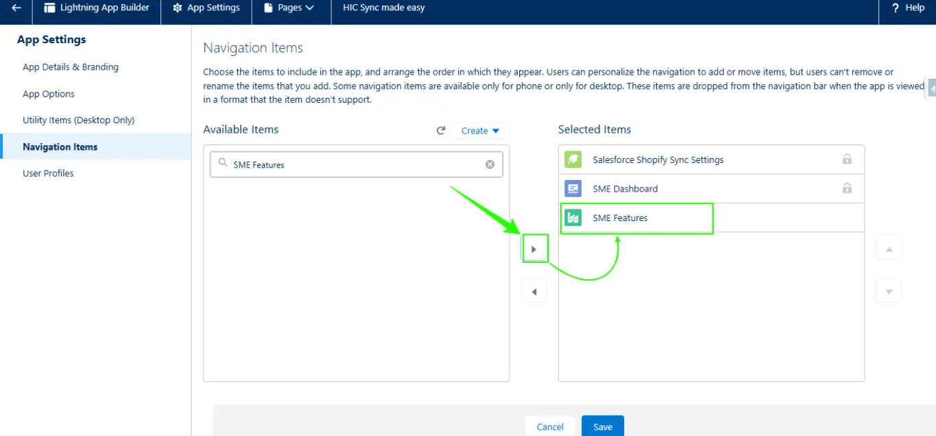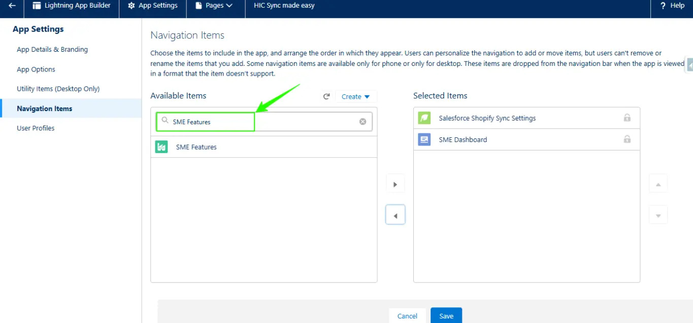 6. Now Search for “SME Features” options in the “Available Items” of Navigation Items as below.