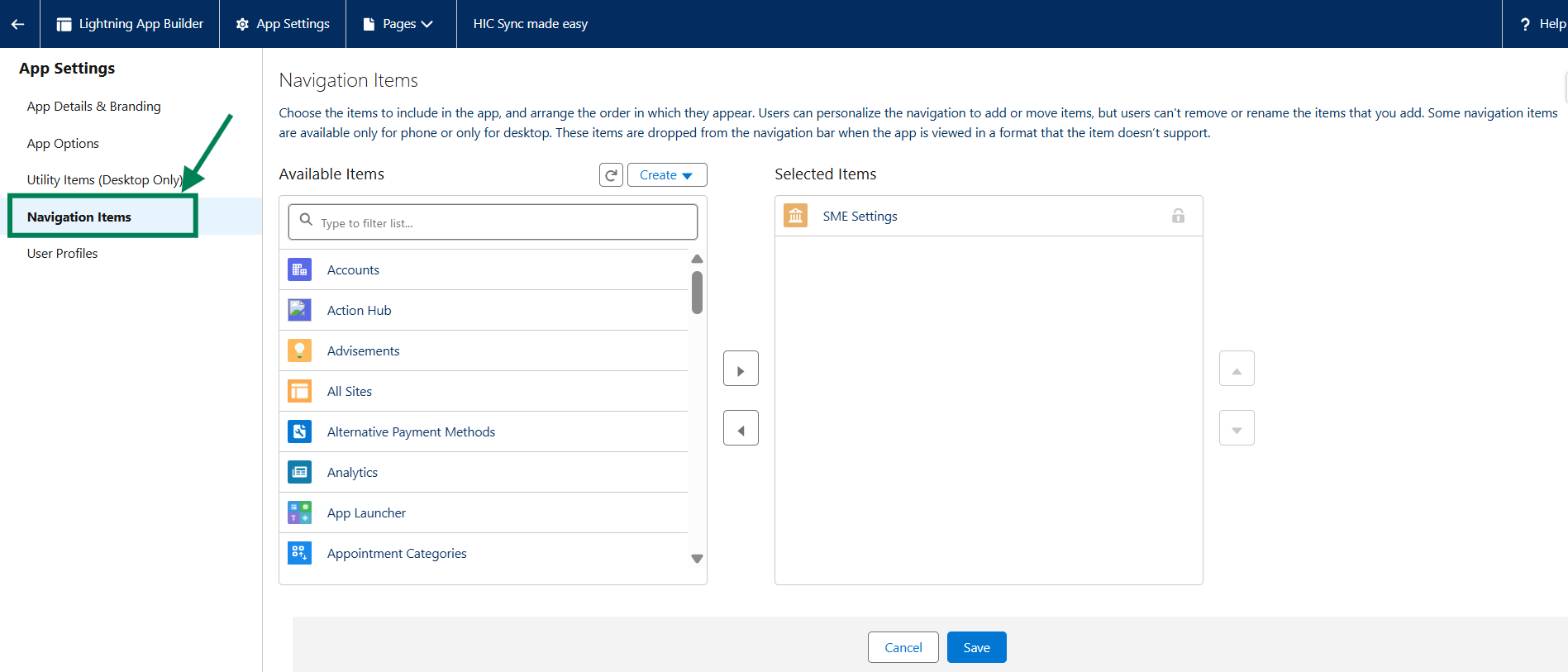 5. Go to “Navigation Items” under the “App Settings” option and click on it.