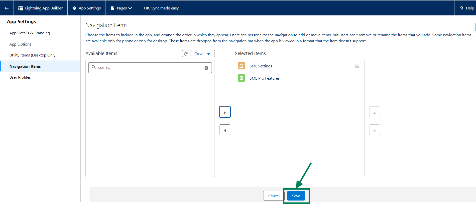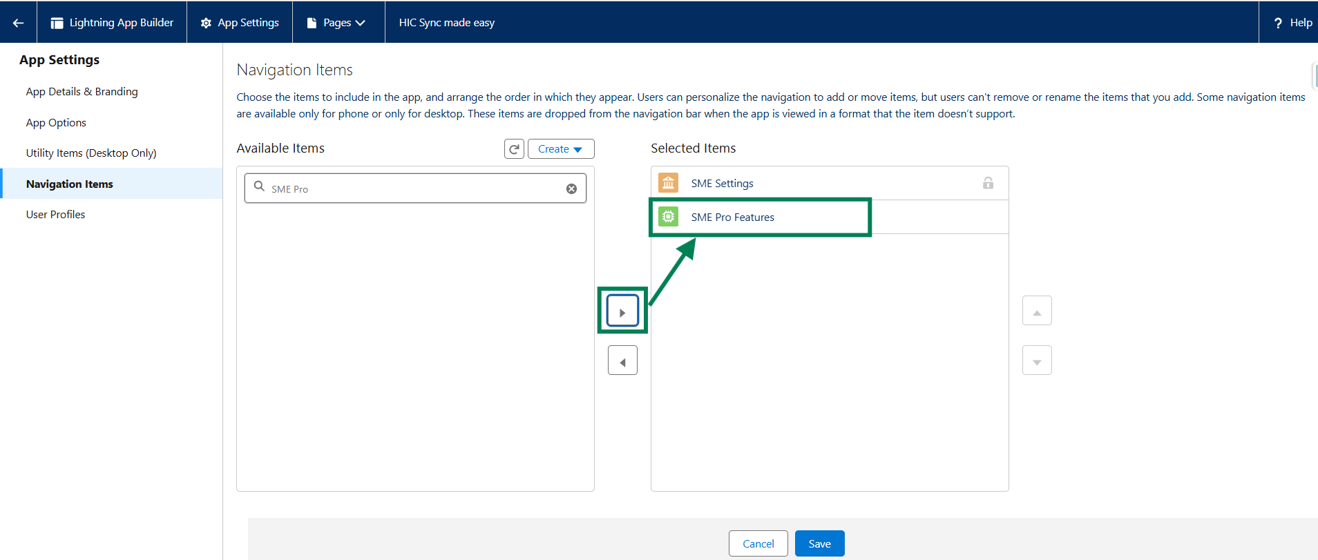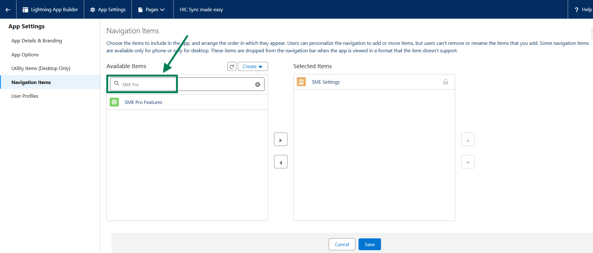 6. Now search for “SME Pro Features” options in the “Available Items” of Navigation Items as below.