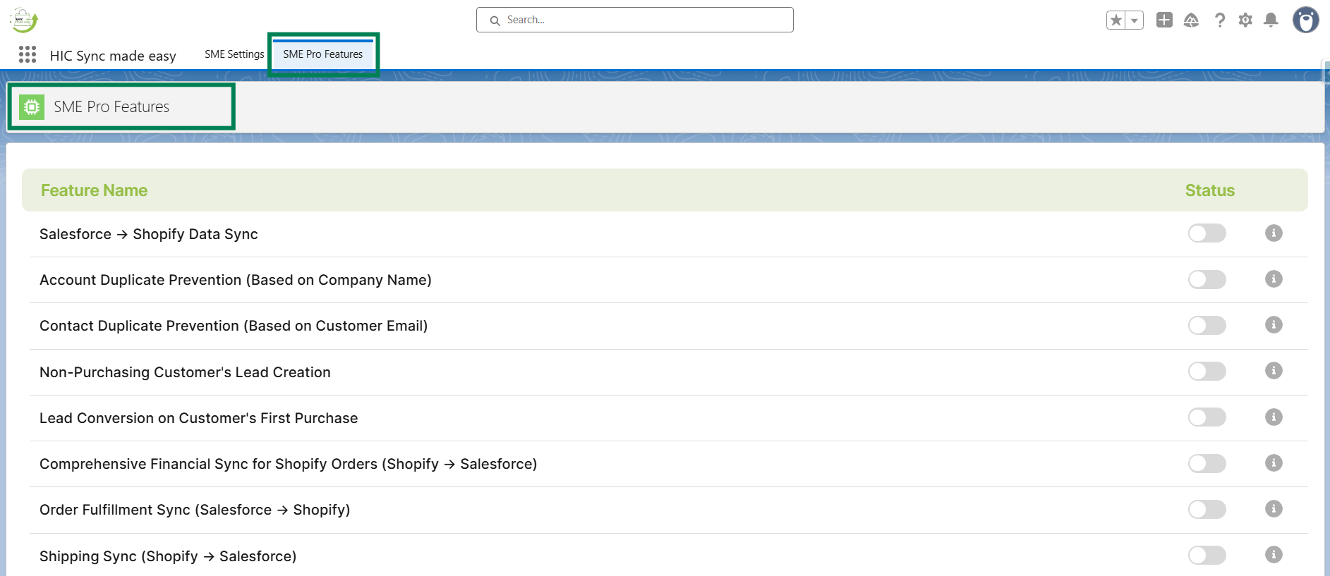 10. Now, click on the “SME Pro Features” tab, and you can see the lightning page (SME Pro Features) on the Main app (HIC Sync made easy) layout as below.
