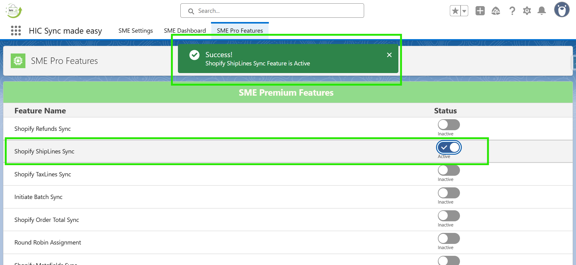 Step 3: Enable the “Shopify Shipping Lines Sync” feature toggle button to activate it.
