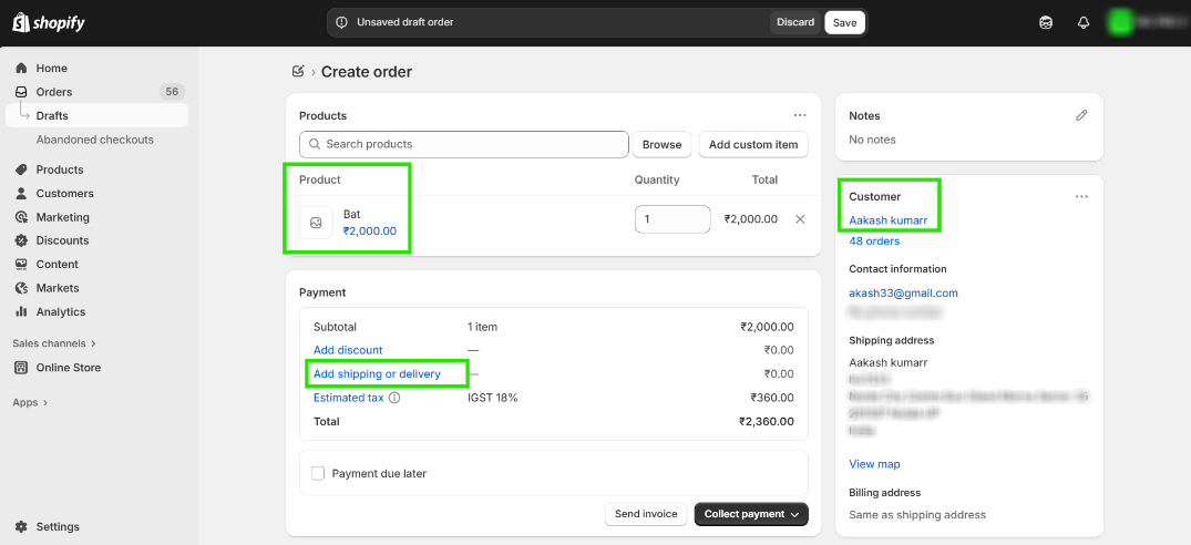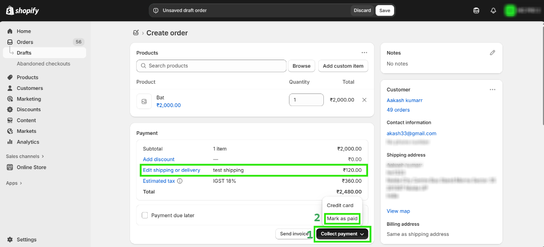 Step 6: Once the shipping amount is added, click on Collect Payment and then click on Mark as Paid to finalize the order.