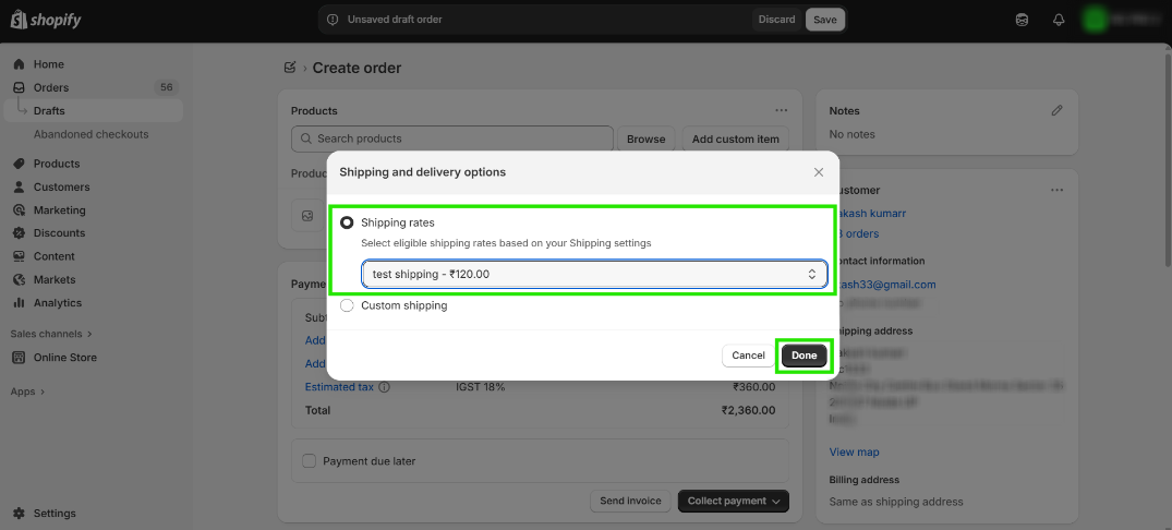 Step 4: Go to the Shopify store and create a new order with shipping.