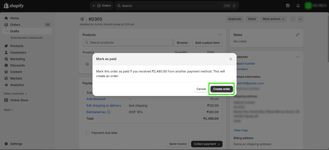 Step 7: Click on Create Order to complete the process in Shopify.