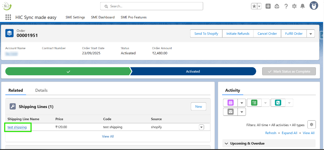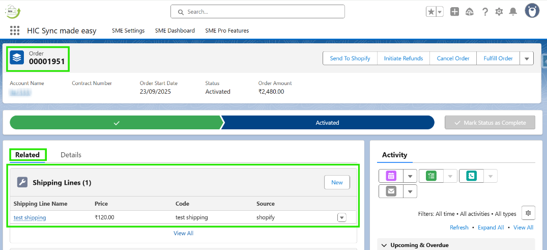 Step 10: Open the order record in Salesforce and navigate to the related section. Here, you will see that shipping lines have been created.