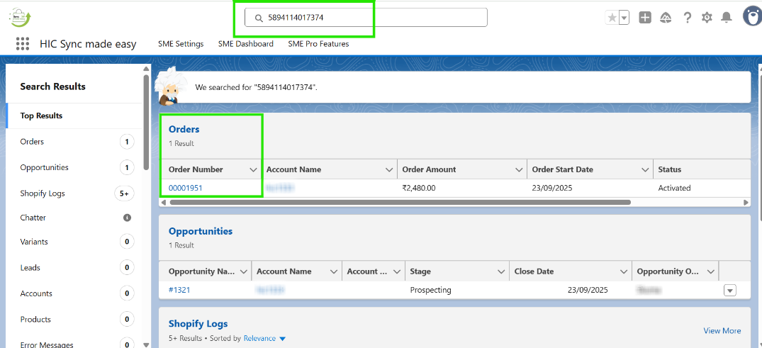 Step 9: In Salesforce, search for the order using the "Shopify ID" and confirm that the order has been synced.