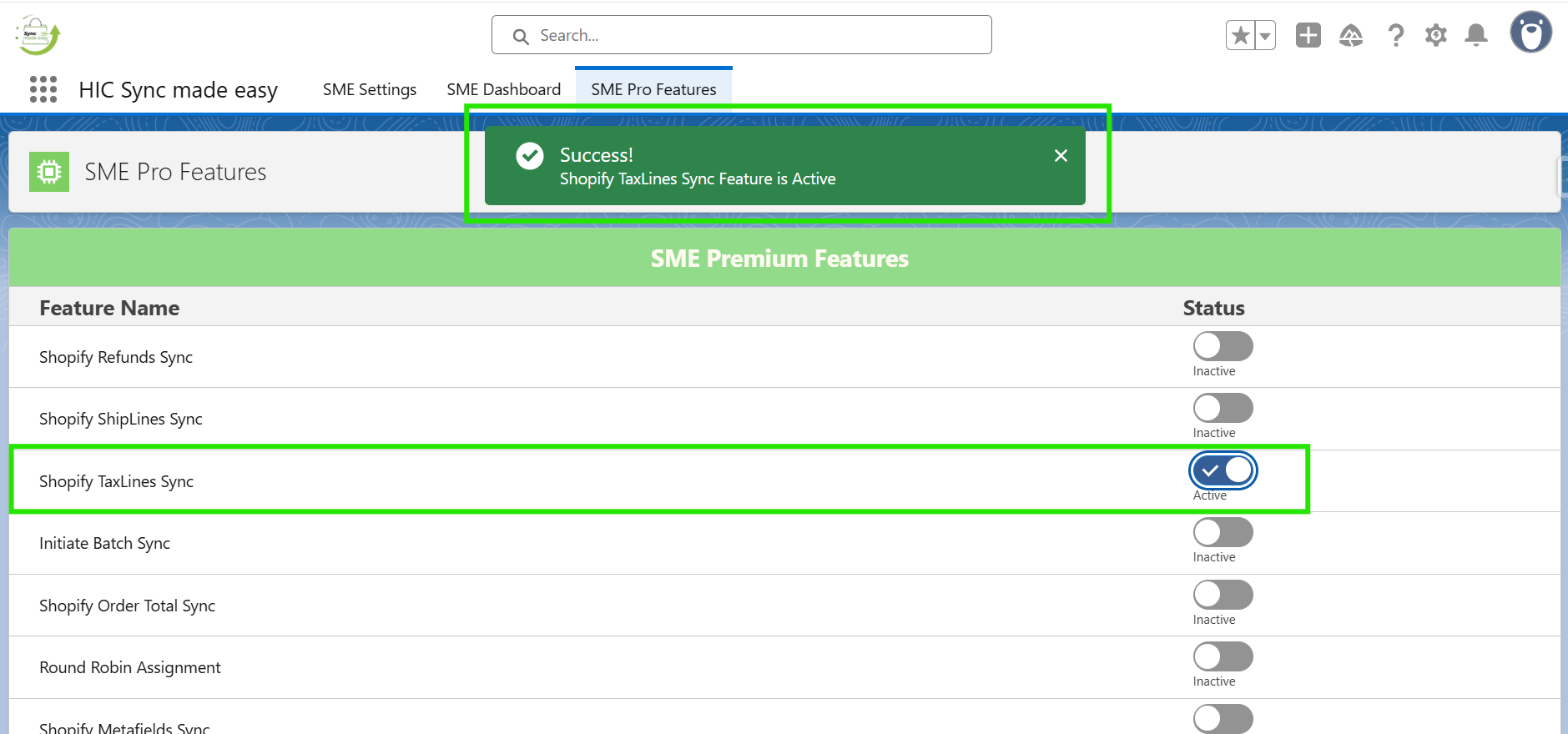 Step 3: Enable the “Shopify Tax Lines Sync” feature.