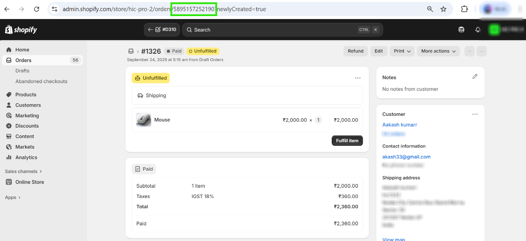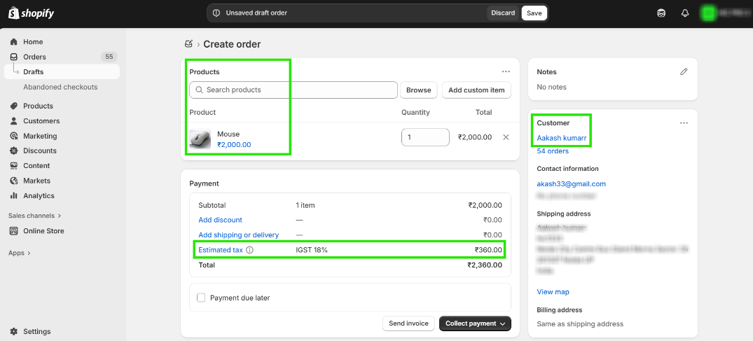 Step 4: Go to your Shopify store and create an order that includes estimated tax.