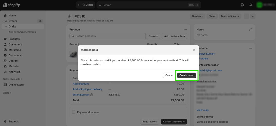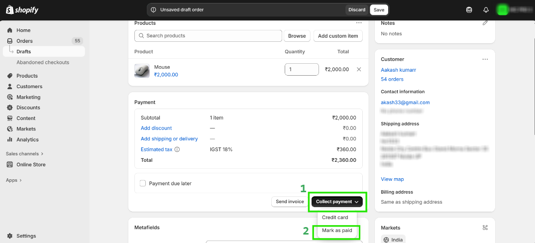 Step 5: Click on “Collect Payment” and mark the order as paid by selecting “Mark as Paid”.