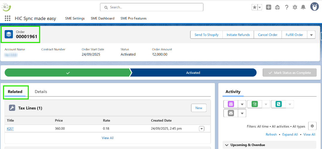 Step 9: Open the "Order" in Salesforce and navigate to the "Related" section of the order.