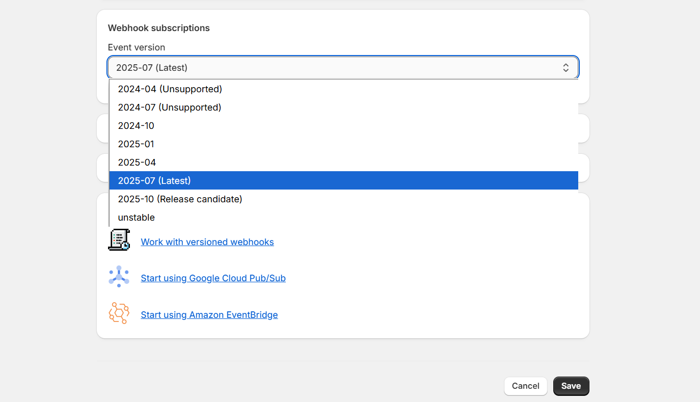 Step 7: Scroll down to “Webhook Subscriptions” and change them to the latest version, then click on save.