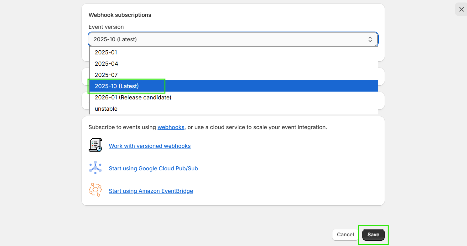 Step 7: Scroll down to “Webhook Subscriptions” and change them to the latest version, then click on save.