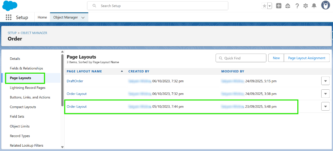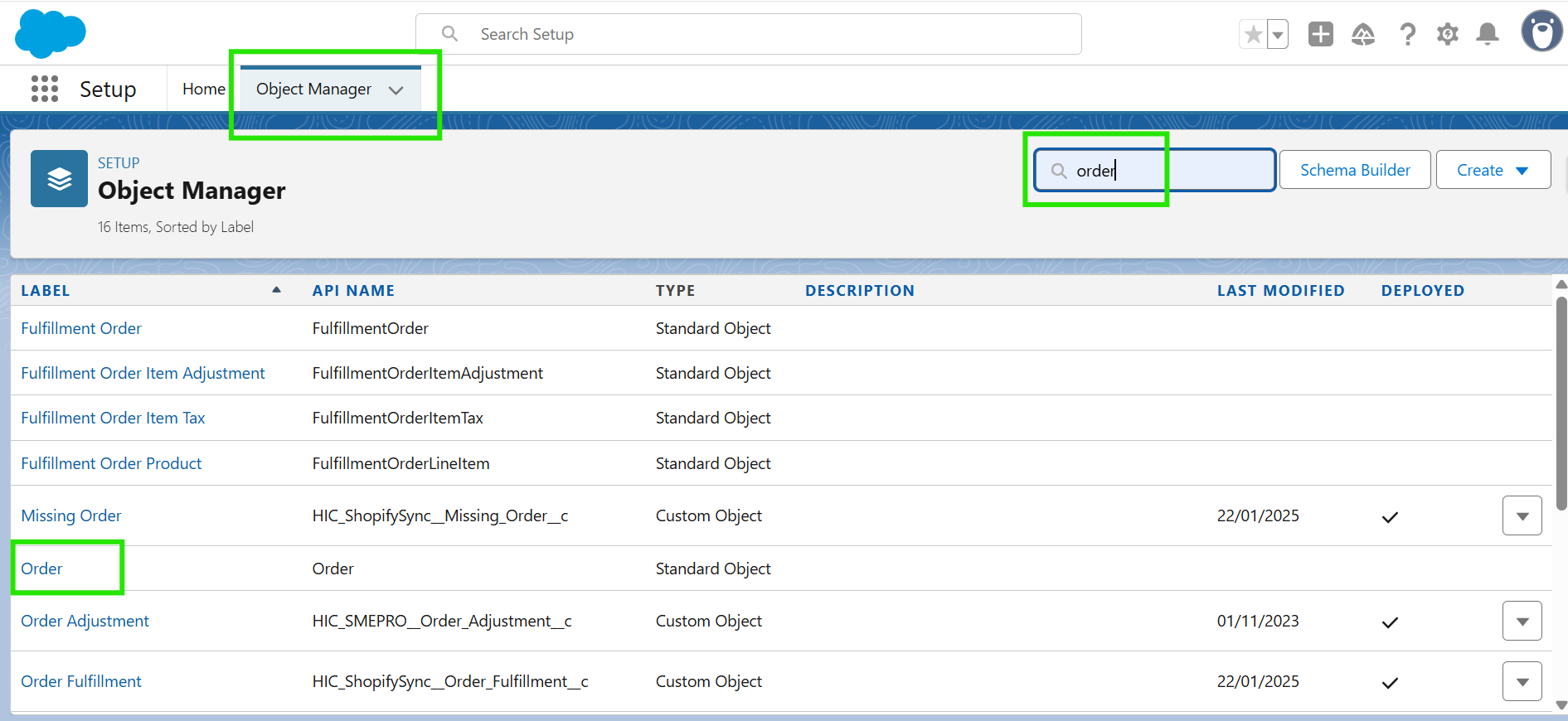 Step 3 – Click on Object Manager and search for “Order” in the search bar, then click on it to open.