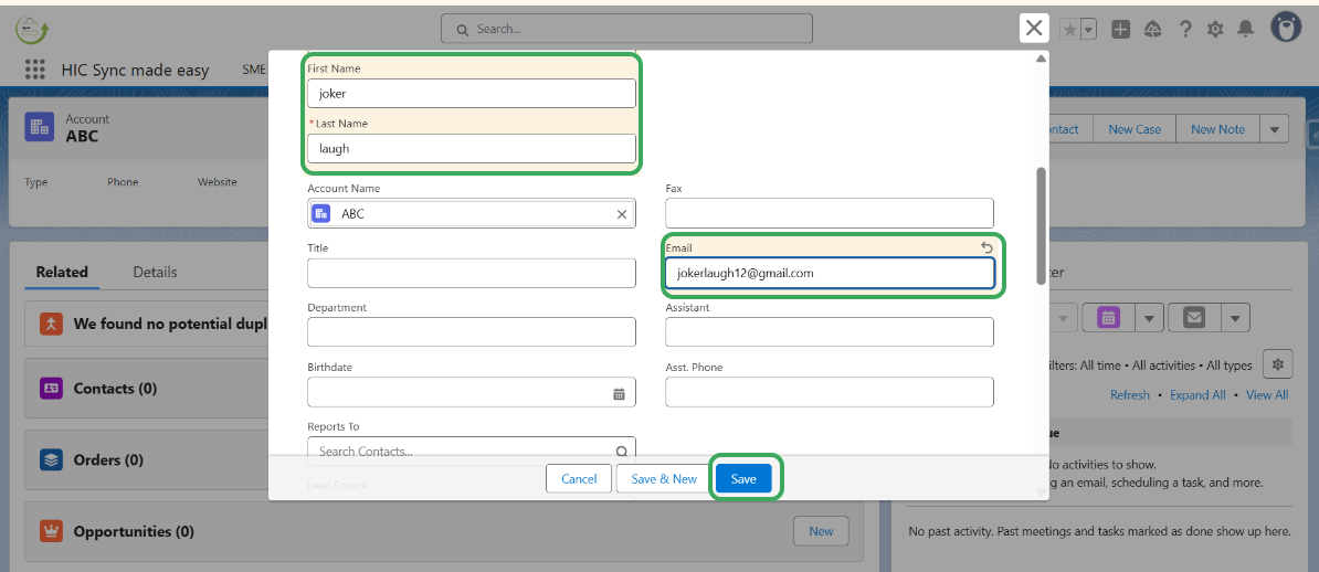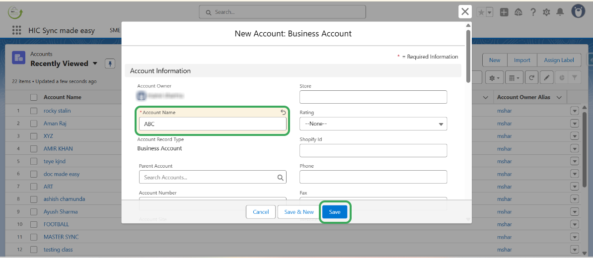Step 4: Navigate to the Salesforce Account page and create a new account named ABC , then click Save.