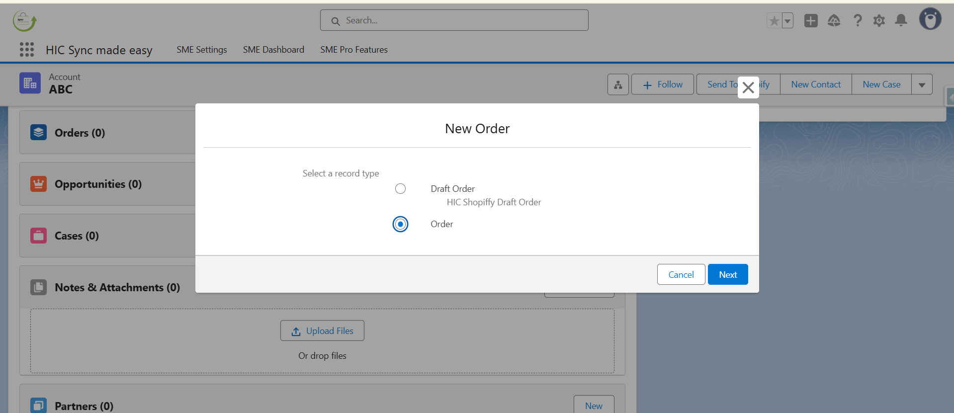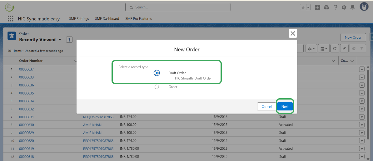 Step 1: Create a Draft Order in Salesforce with the record type set as “Draft Order”, then click Next.
