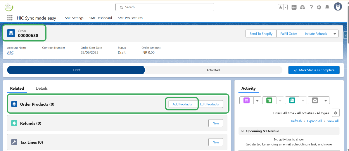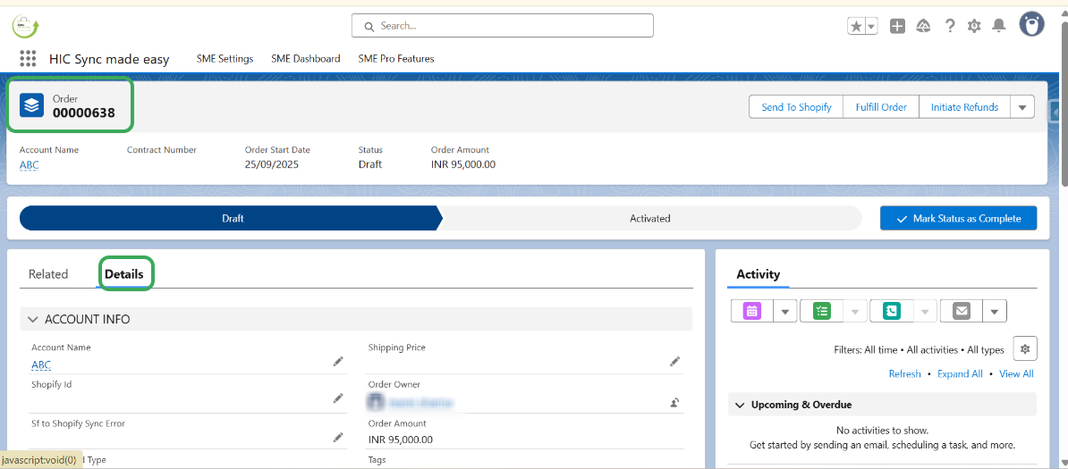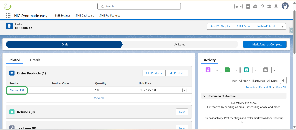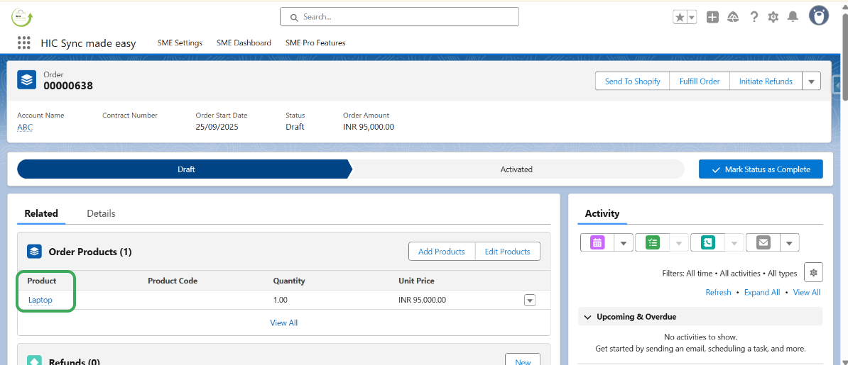 Step 18: Open the Order in Salesforce and refresh the page to check the Order status. The status should change from Draft to Activated.