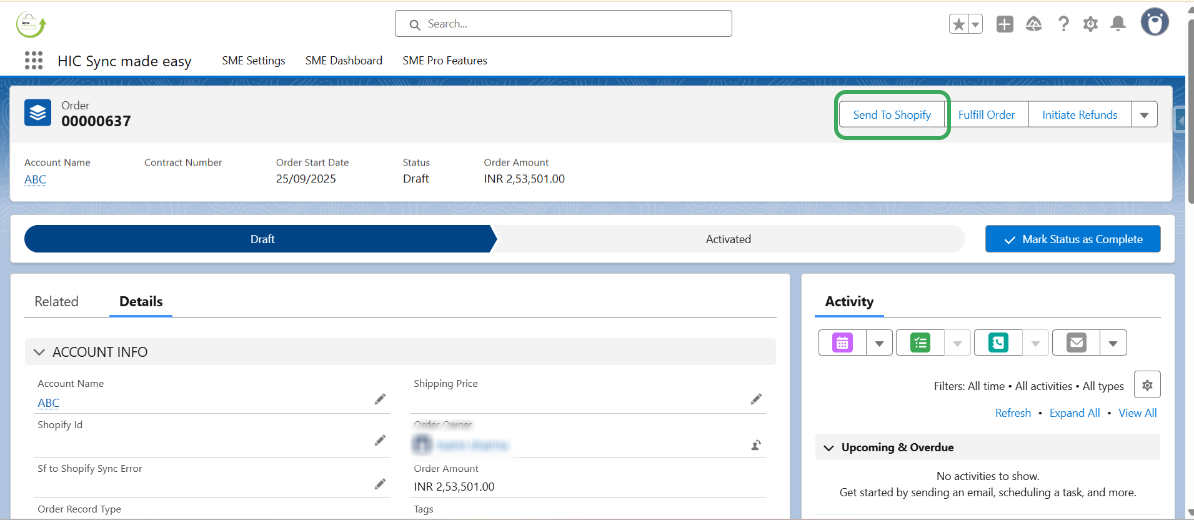 This guide explains the Send to Shopify button, available on the Account, Product, Order, Draft Order, and Opportunity objects. This feature enables seamless synchronization of records from Salesforce to Shopify for all these objects.