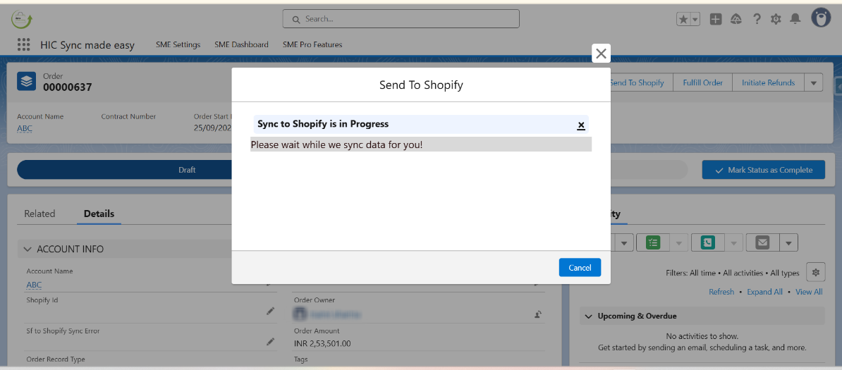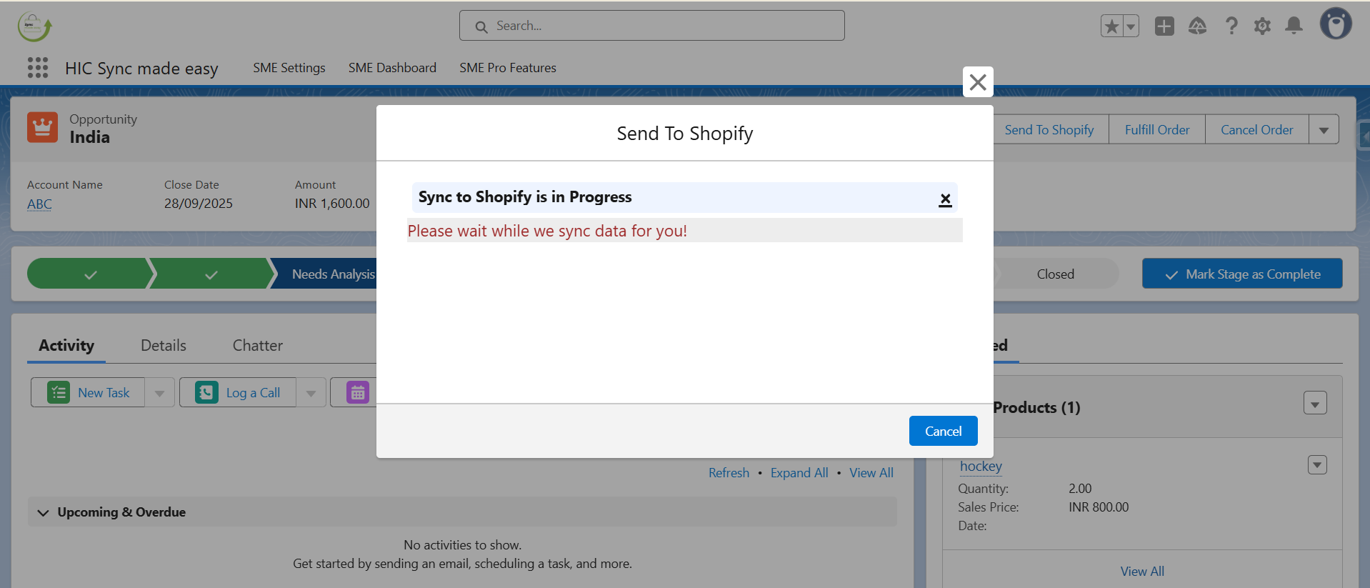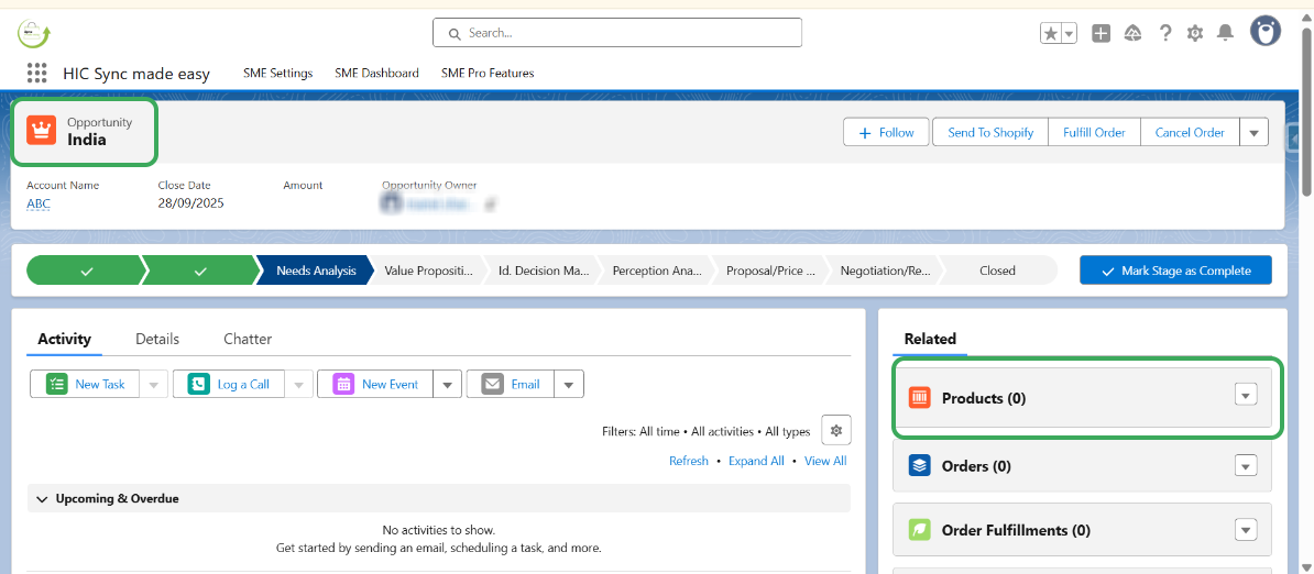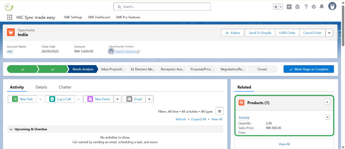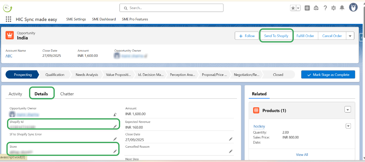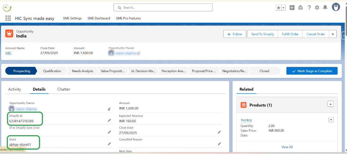 Step 14: Confirm that the Opportunity has been successfully synced to Shopify using the Send to Shopify feature.