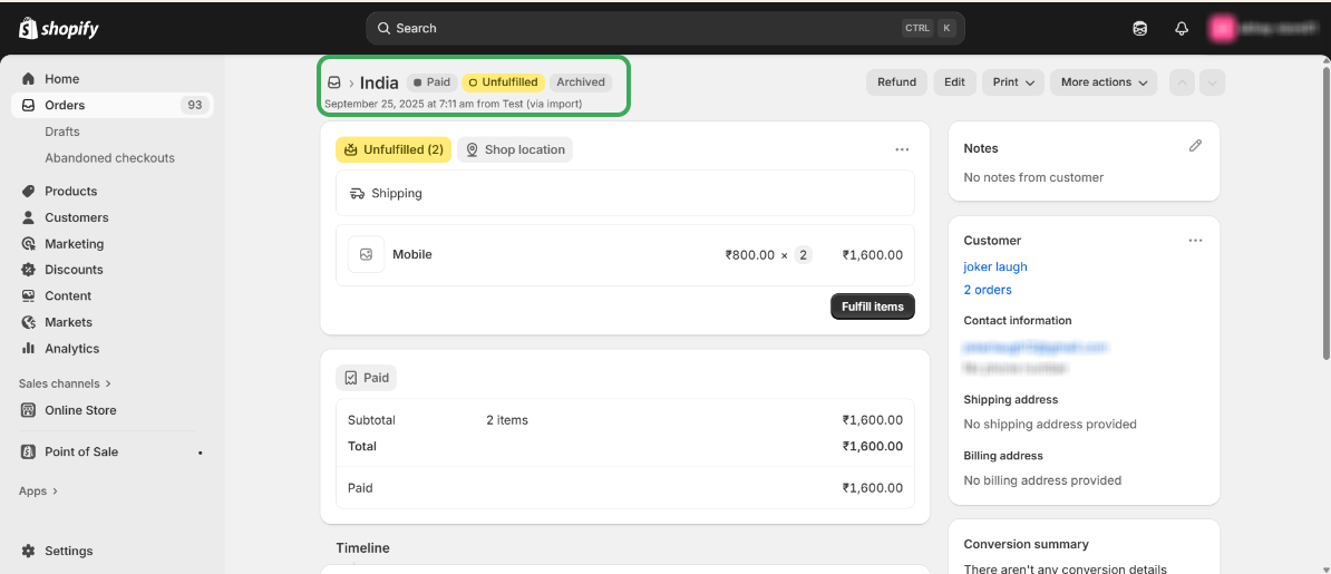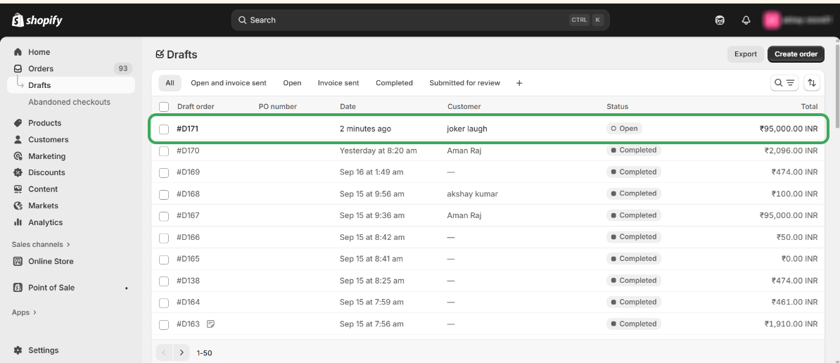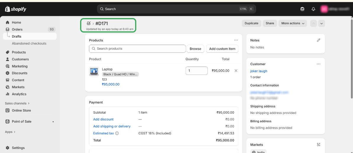 Step 13: Refresh the Shopify Draft Order page, and you will observe that the Draft Order has been created.