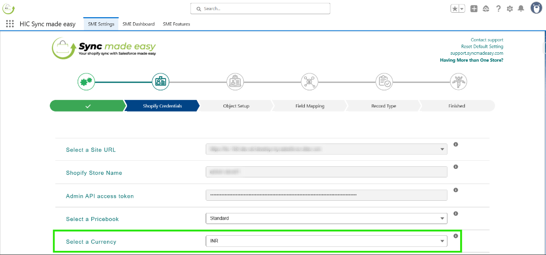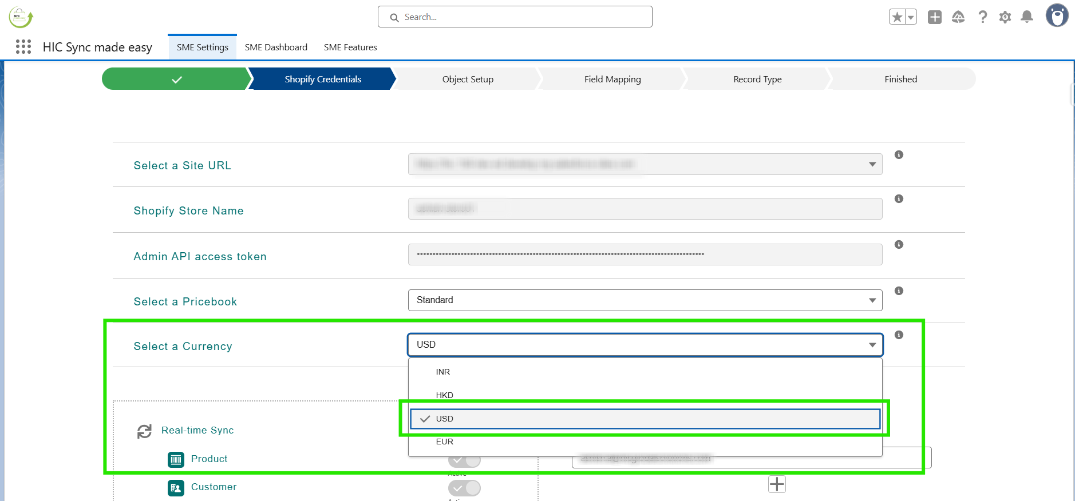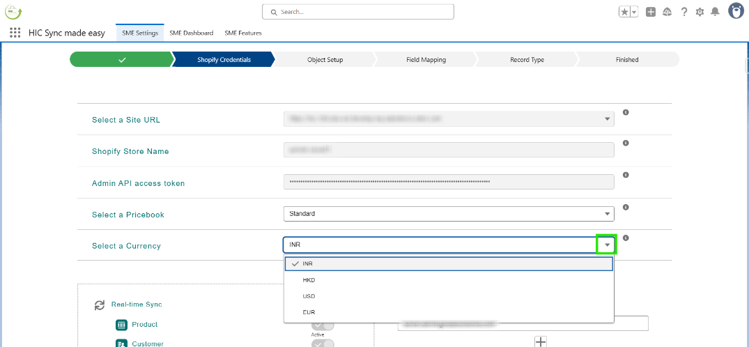 Step 1 – Navigate to the Shopify Credential section and select a currency from the available currency field.