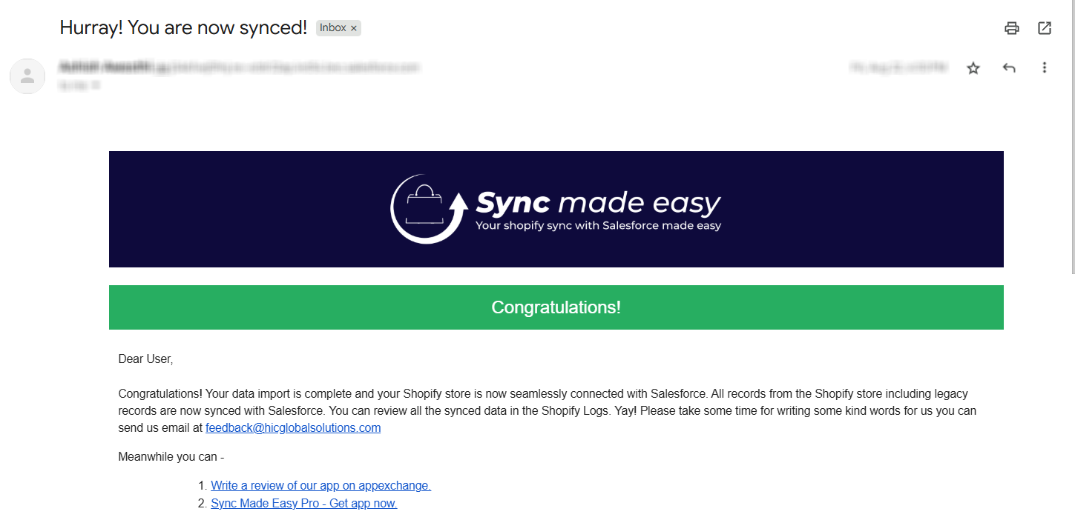 Step 4 – Once you sync all your legacy records from Shopify to Salesforce, you’ll receive an email notification confirming the sync is complete.