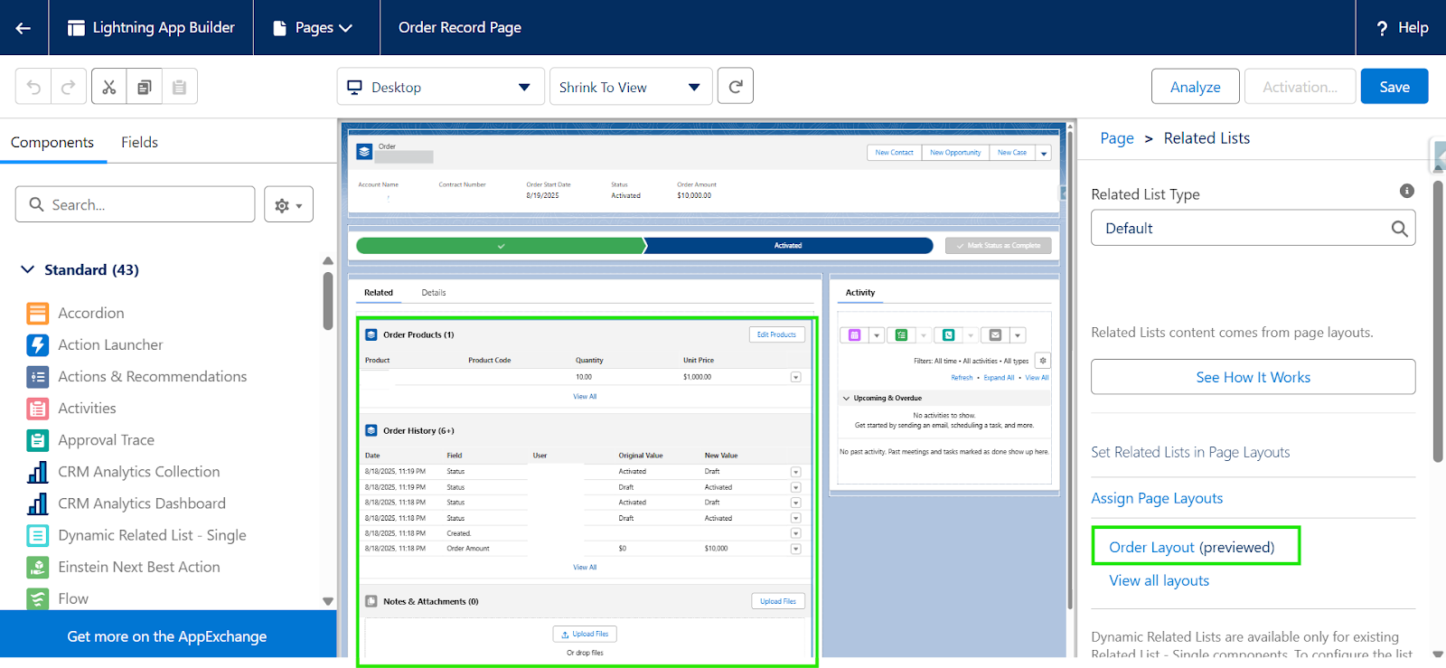 Step 2: On the record page preview, click the object (either in the Related or Details section), and then select Object Layout (as shown in the preview).