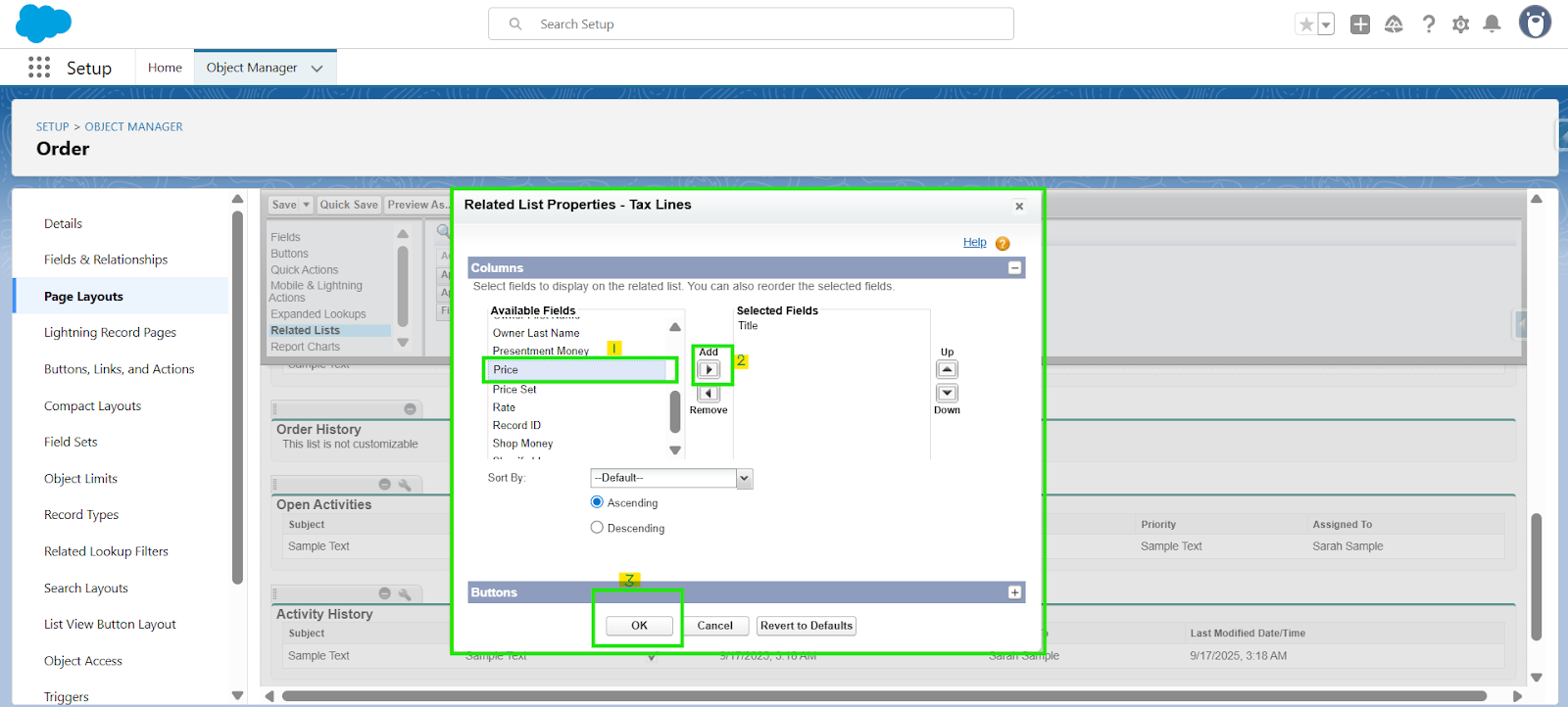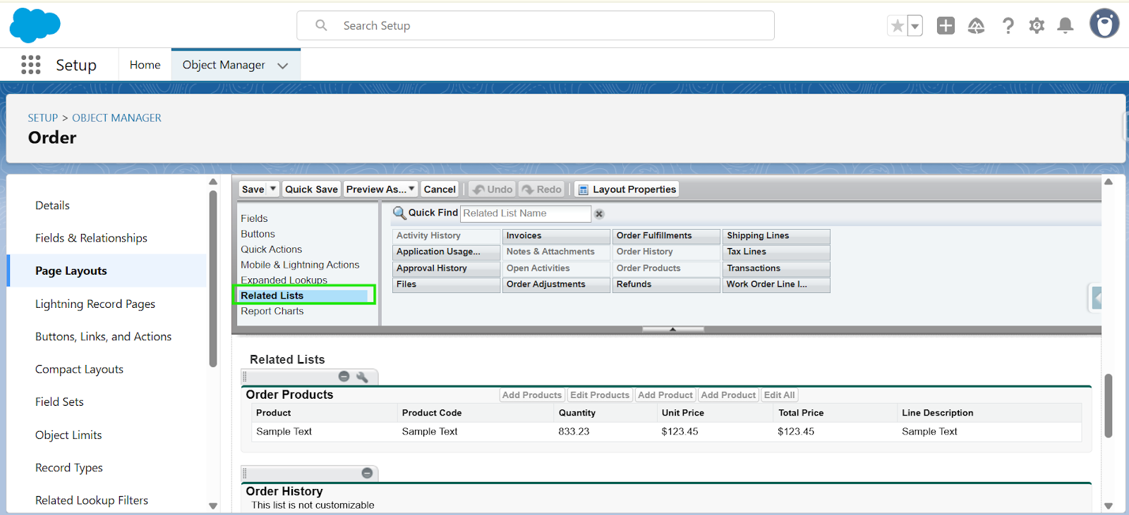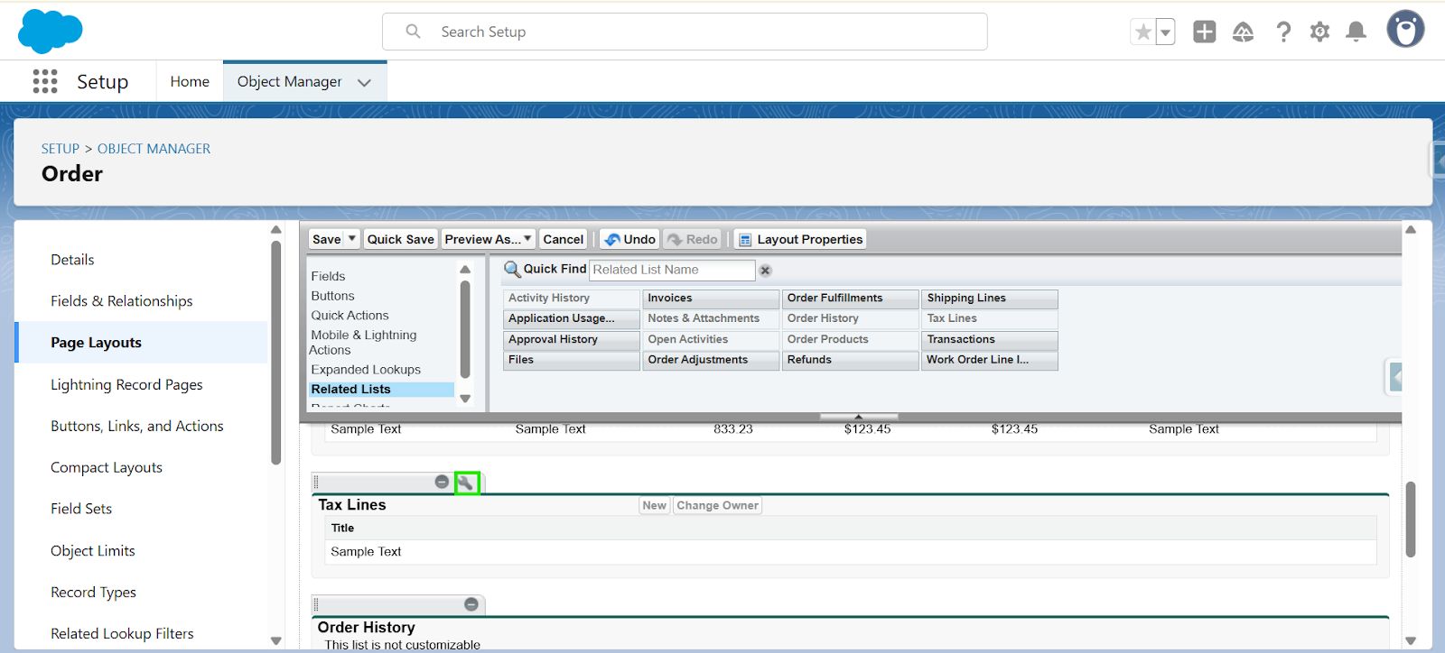 Step 3: In the Page Layout editor, go to Related Lists, and drag the required related list item (e.g., Tax Lines) into the Related Lists section.