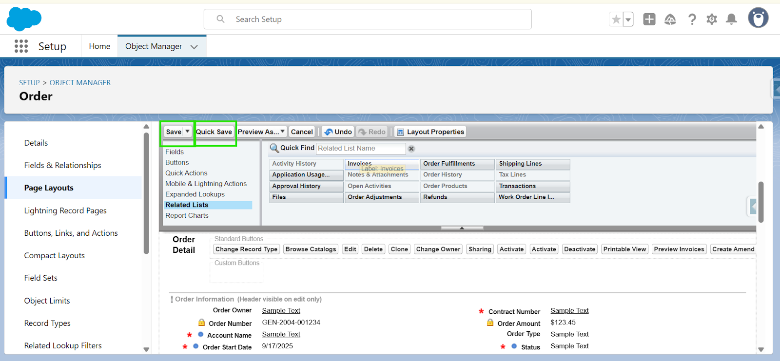 Step 3: After editing the related list, click Quick Save, and then Save to apply your changes