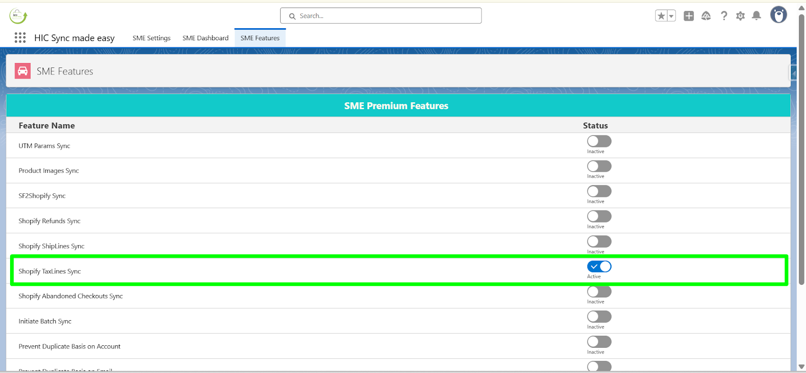 Step 3: Enable the Shopify TaxLines Sync feature.
