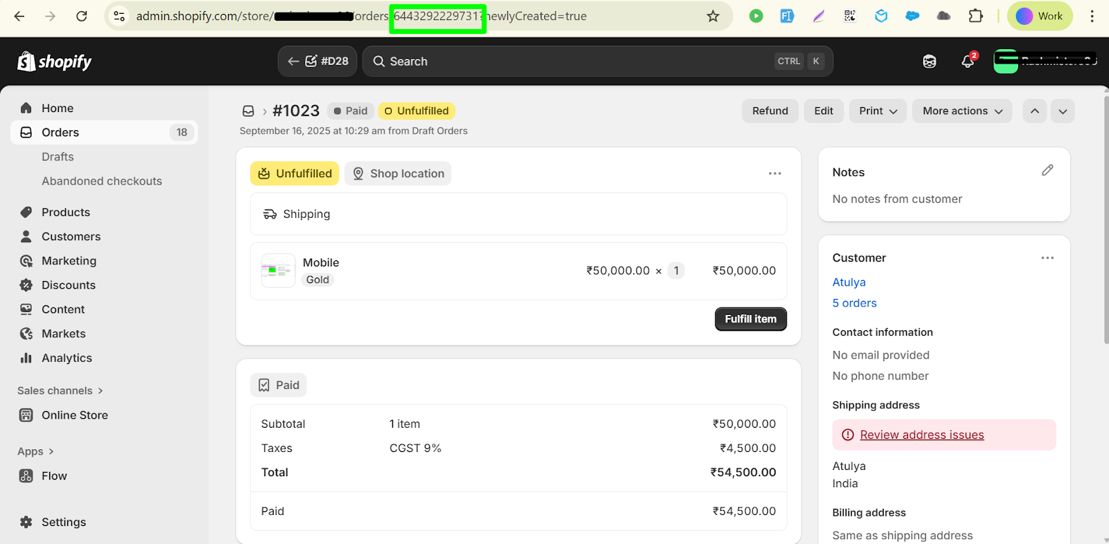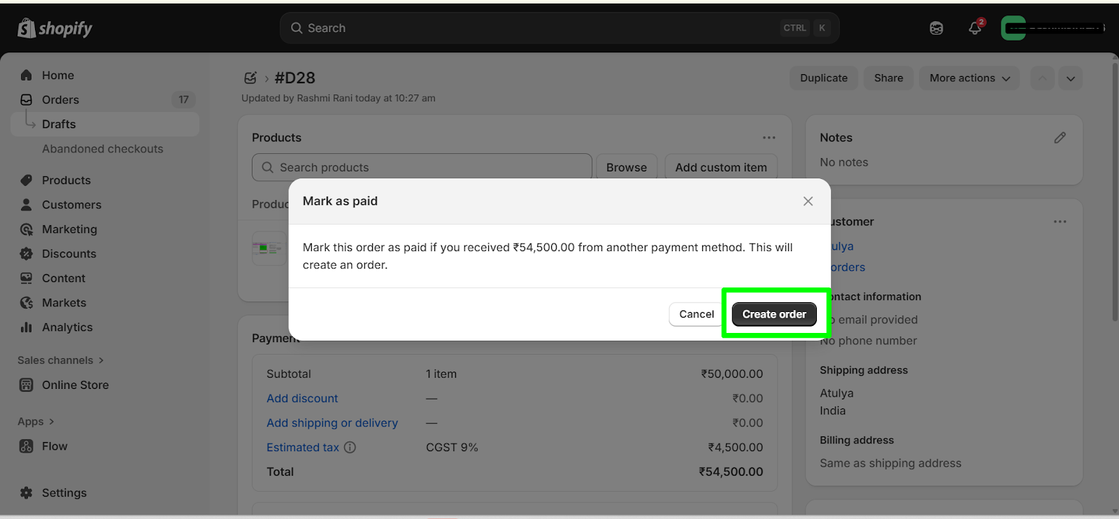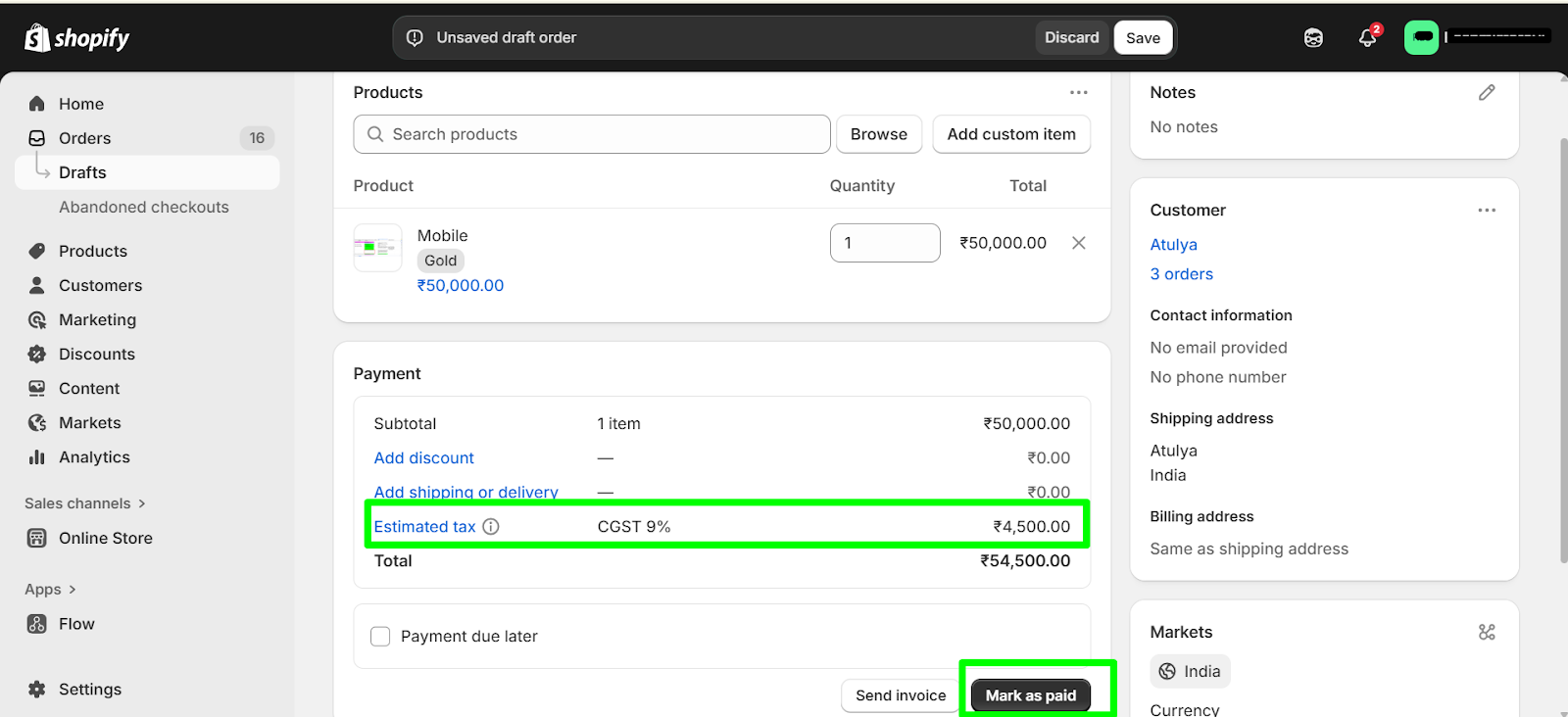 Step 4: Go to the Shopify store and create a new order by clicking Create order. Add a product and ensure that Tax is applied on the order And Click Mark as paid.