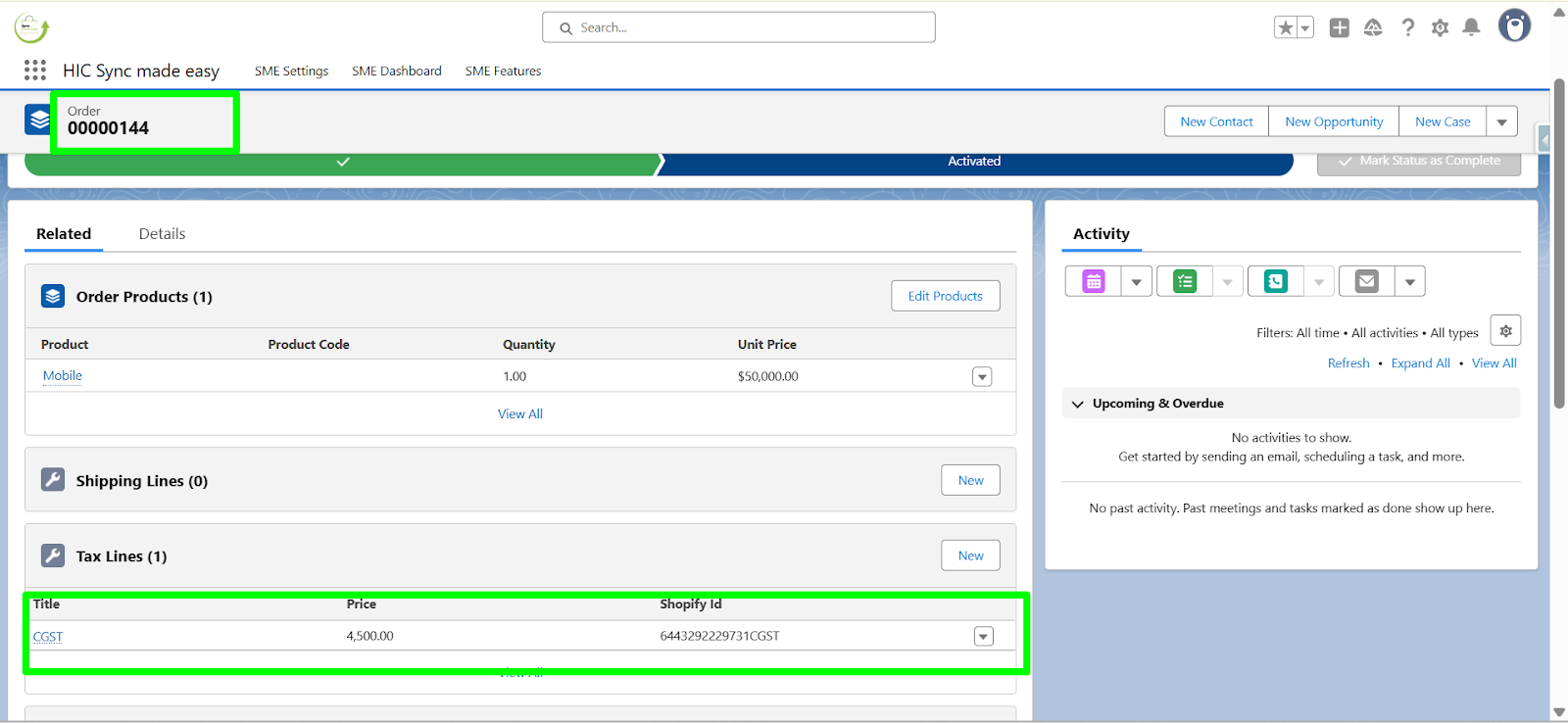 Step 8: Navigate to the Related section of the Order. You will see that the Tax Line has been created.
