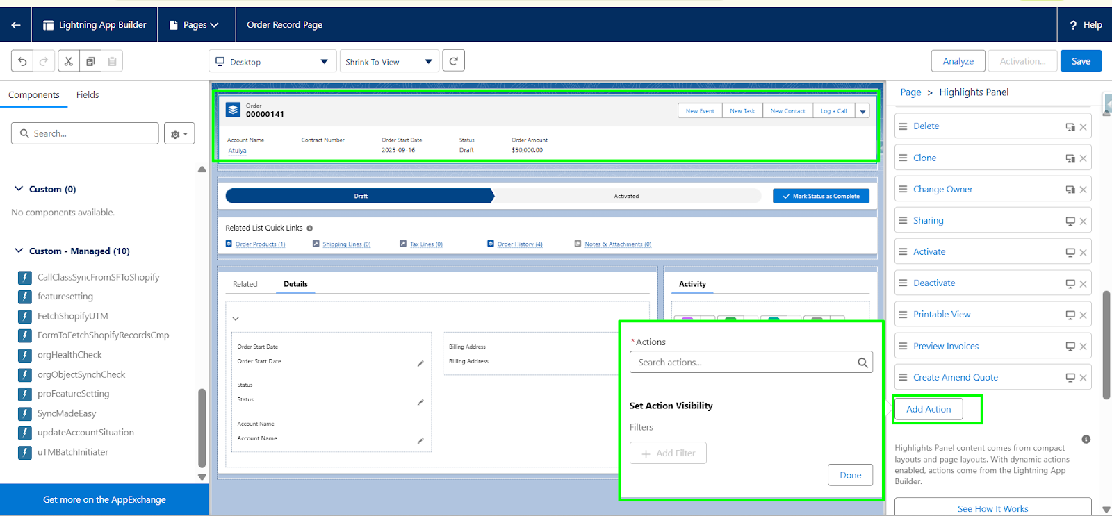 Step 1: From the Lightning App Builder, select the section where you want to add a button, scroll down the right panel, and click Add Action.