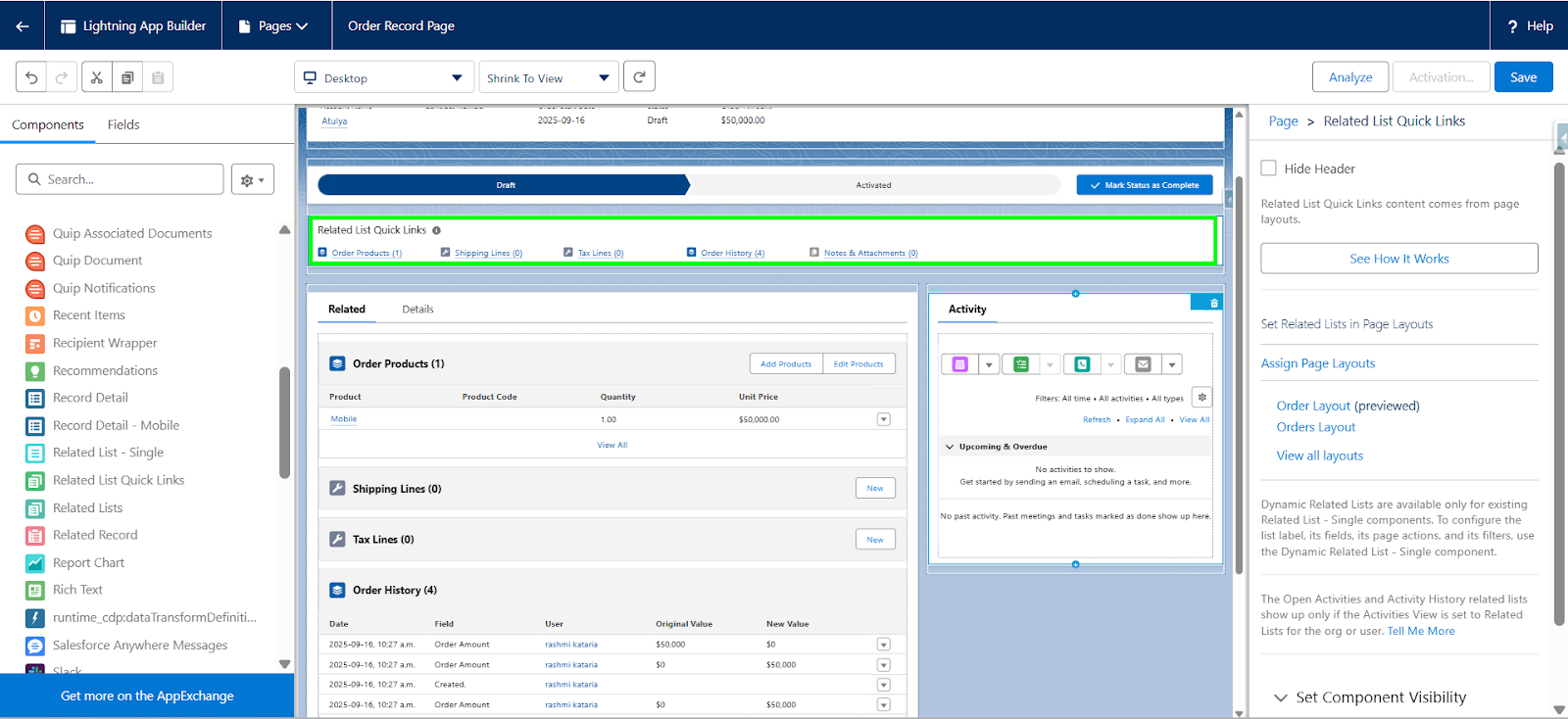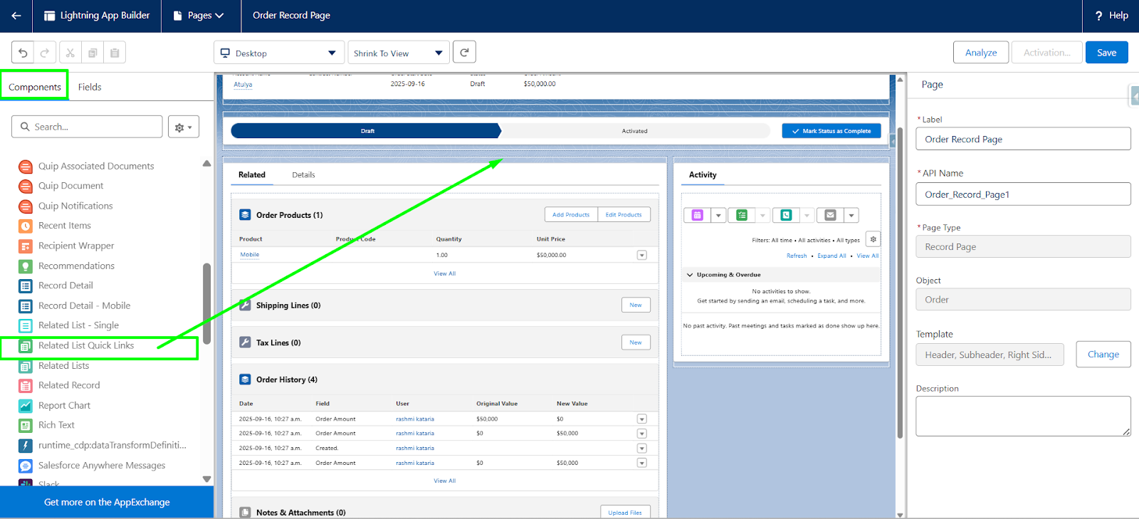 Step 1: In the Lightning App Builder, locate the Related Lists section. Drag the Related List – component from the left-hand panel.