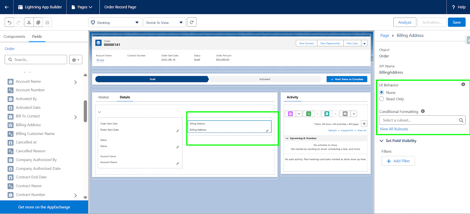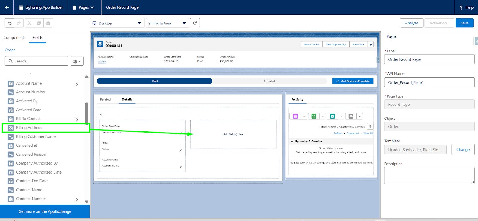 Step 1: In the Lightning App Builder, go to the Fields section, then drag and drop the required field from the left-hand panel to the desired location on the page layout.