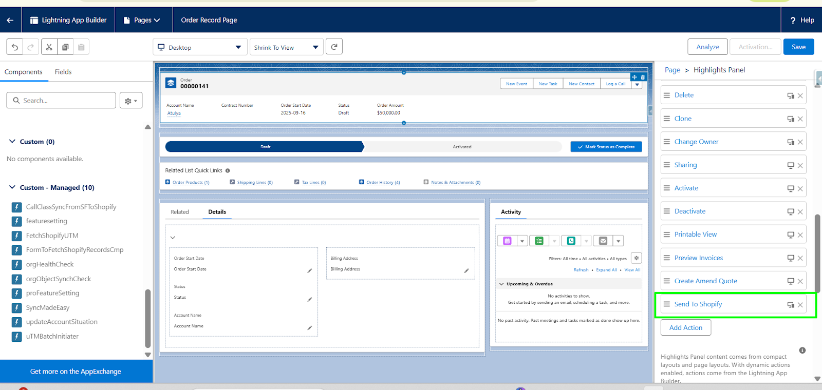 To begin, open the desired record page (for example, an Order). Click the gear icon (⚙) in the top-right corner, then select Edit Page.