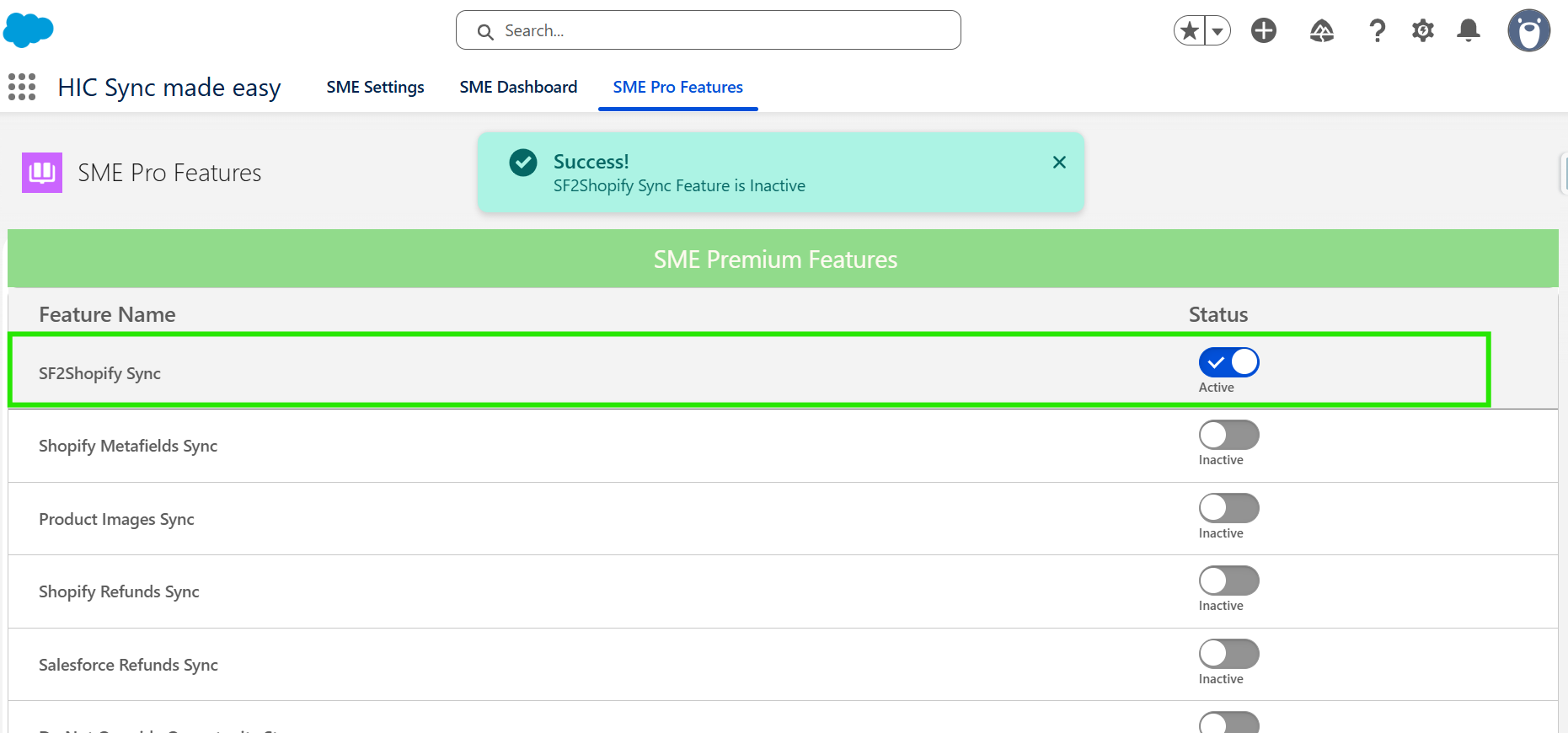 Step 3: Enable the “SF2 Shopify Sync” feature and confirm by clicking OK, I Understand.