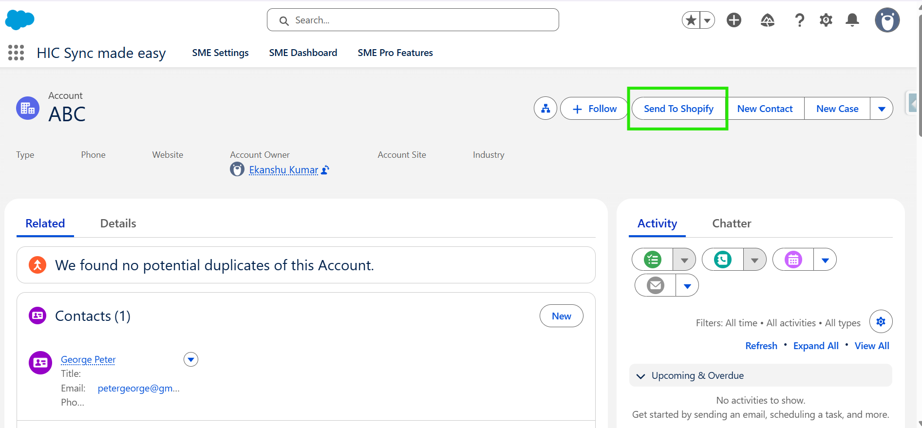 Step 19: Confirm that the account has been successfully synced to Shopify using the Send to Shopify feature.