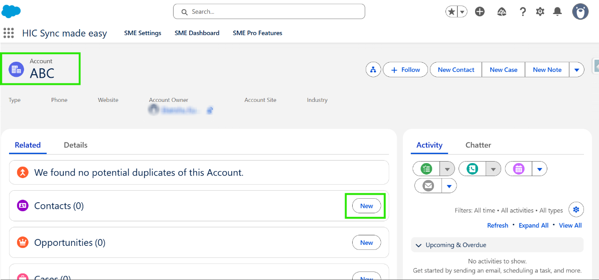 Step 5: Under this account, create a new contact by clicking the New button in the Contact section.