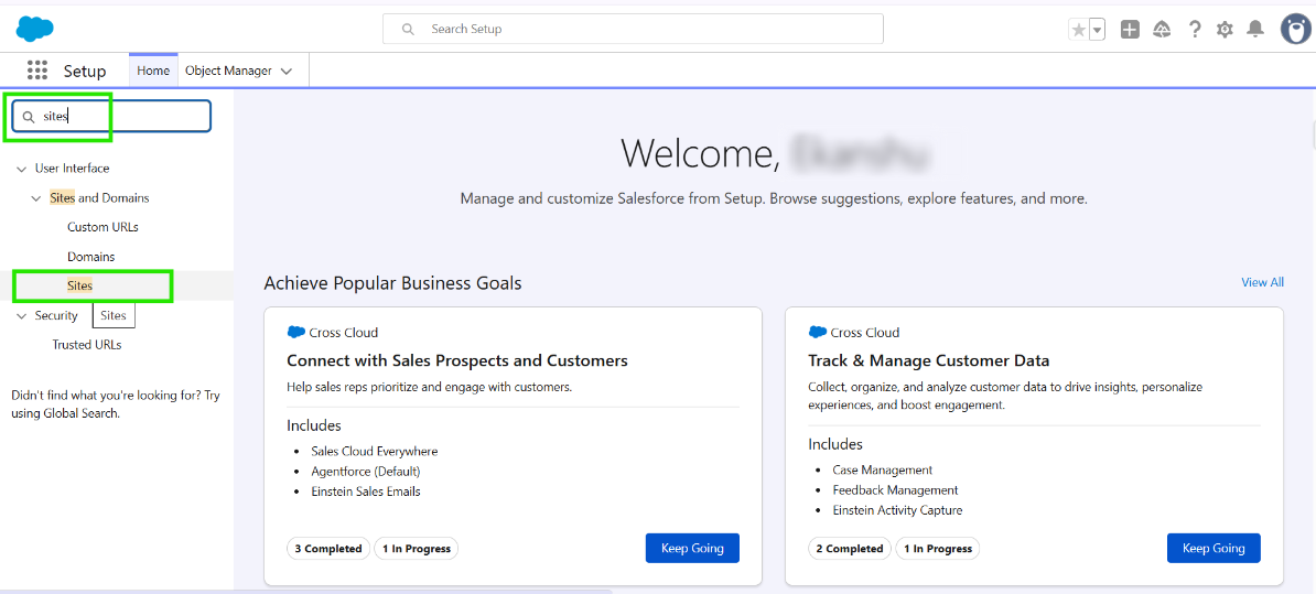 Step 2: In the Quick Find box, search for Sites and click on “Sites”.