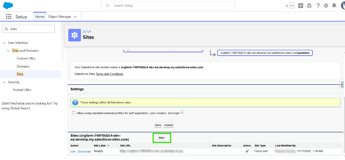 Step 3: Scroll down a bit. If no sites are available, or if you want to create a new one, click “New” and create your site.