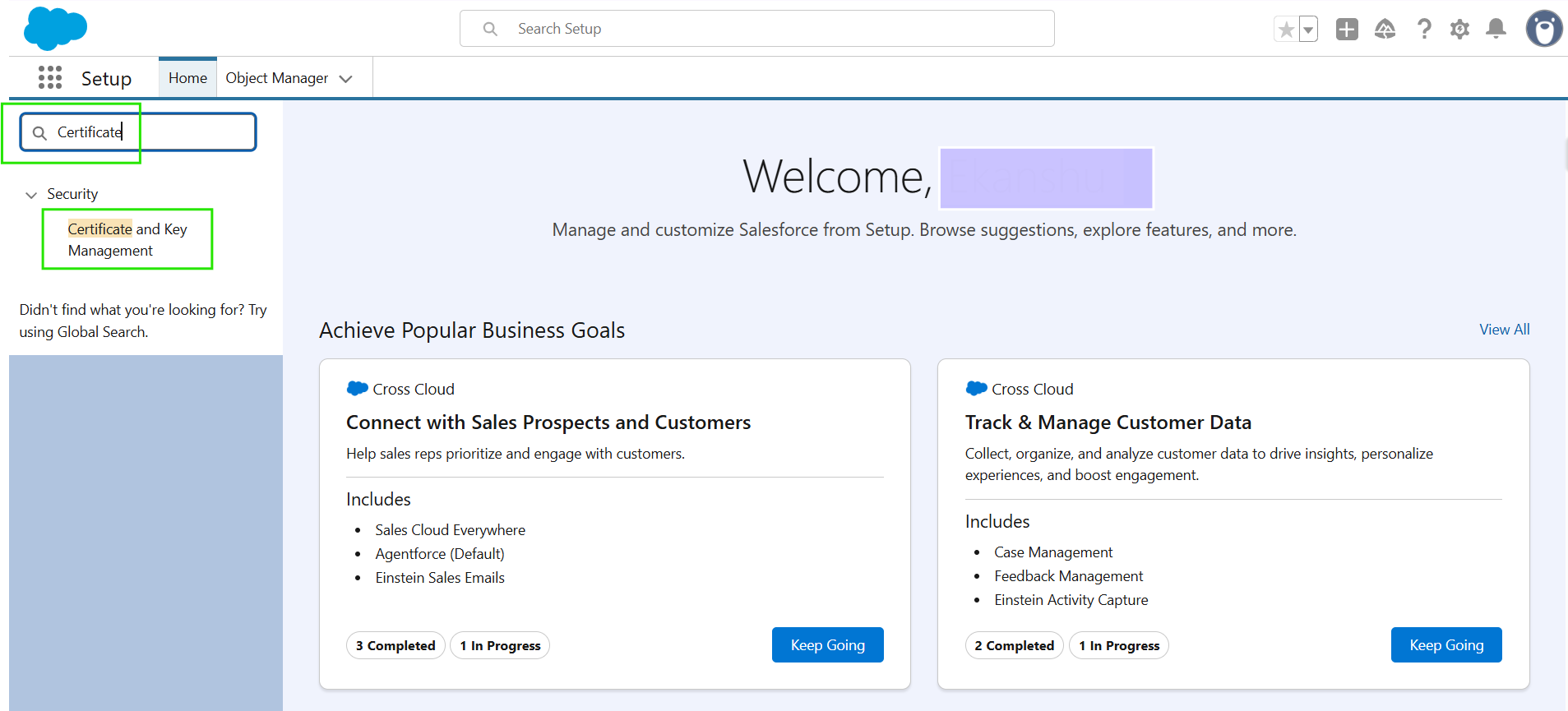 Step 2: In the Quick Find box, search for “Certificate and Key Management” and click on it.