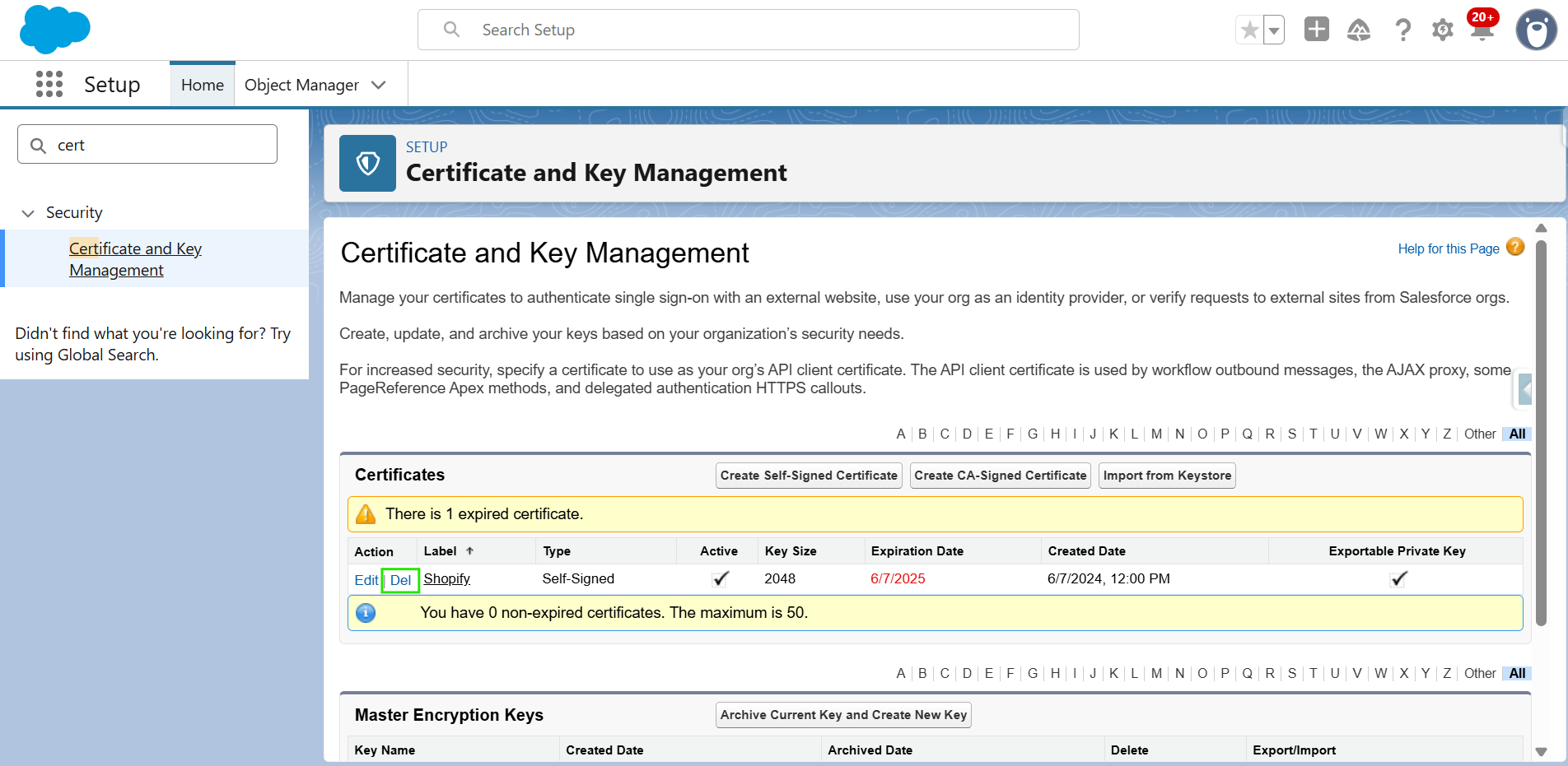 Step 3: If the certificate has expired, delete it by clicking the “Delete” button.