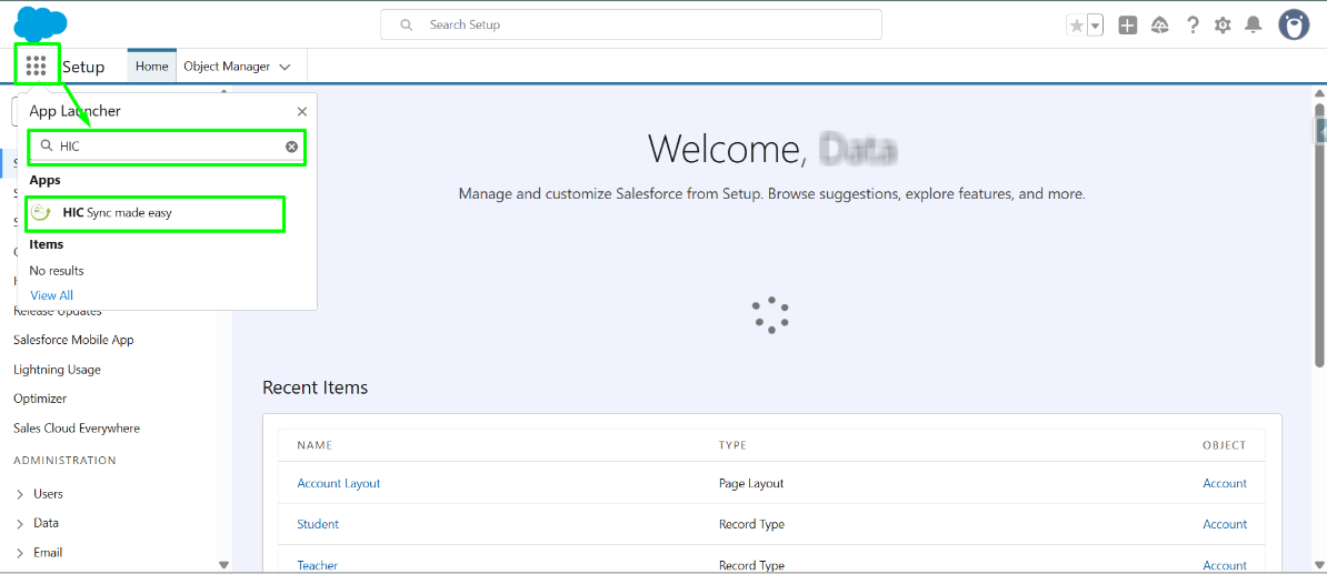 Click on the App Launcher in Salesforce and Search for 'HIC Sync Made Easy'. Click on the app to open it.