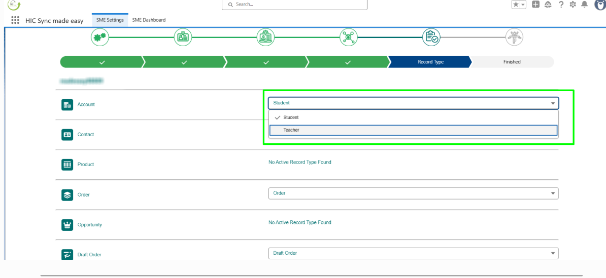 - If the object has more than one record type, click the dropdown (if you want to change the selected record type) and select the required record type (for example, Student or Teacher for Account).
